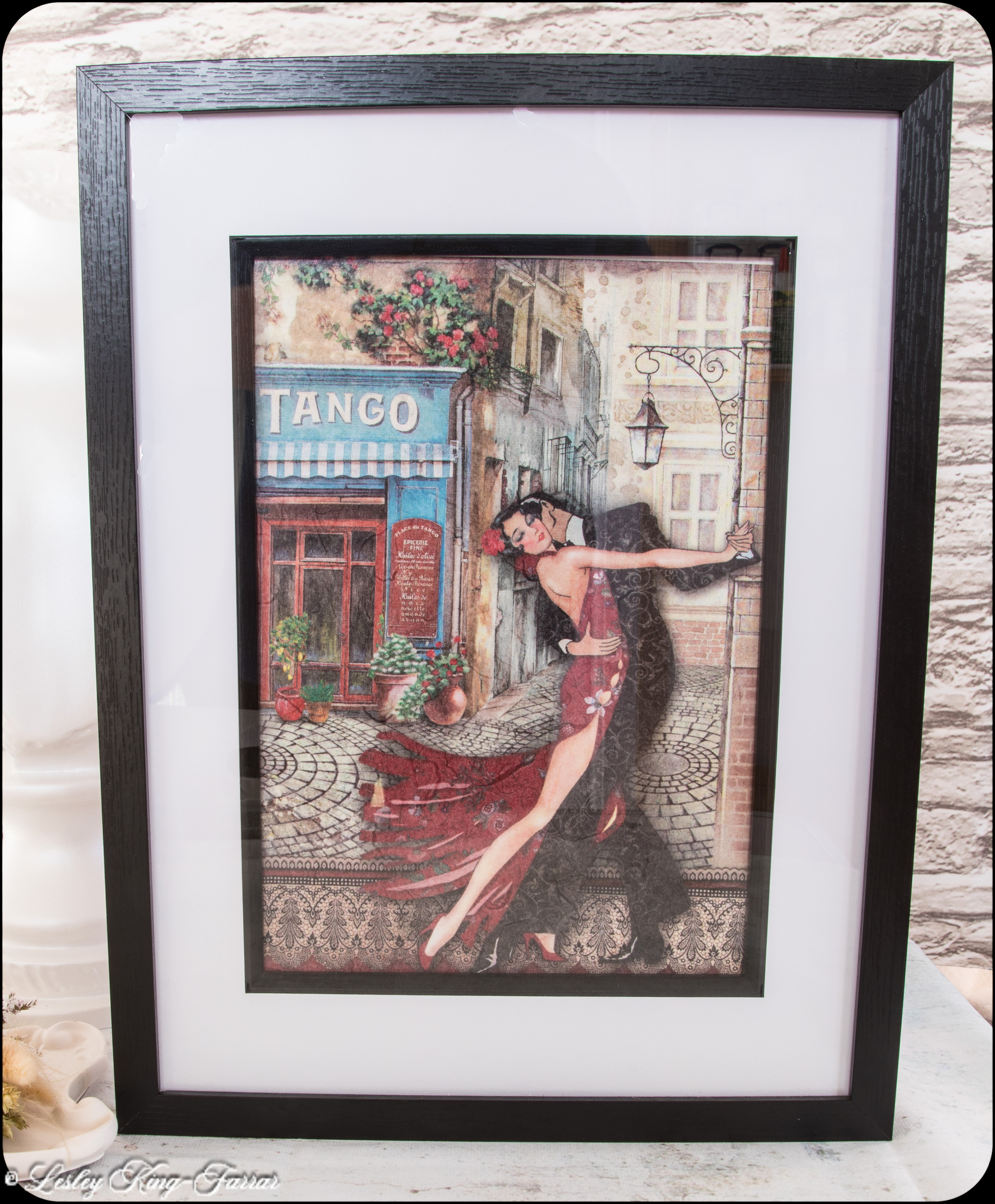 Bring elegance and passion into your home with this striking decoupage picture of a couple performing the tango. Expertly crafted on canvas, the artwork captures the intensity and grace of the dance in timeless detail. The image is bordered by a sleek narrow black edge, further enhanced by a crisp white border, and beautifully enclosed in a modern black frame measuring 32.5cm x 42.5cm.