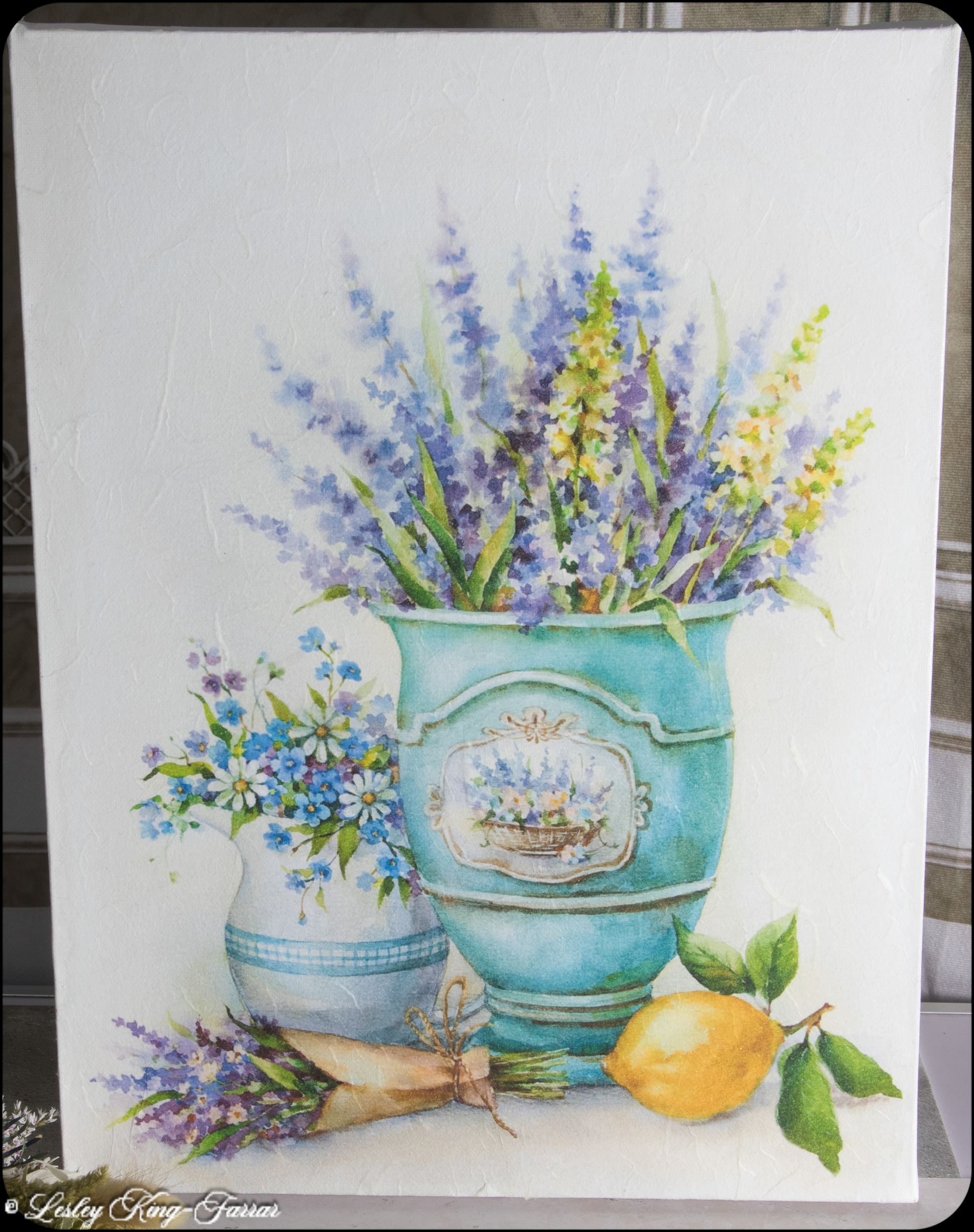 Very pretty, colourful vases of flowers, decoupaged onto streched canvas. This picture can be framed or hung just as it is