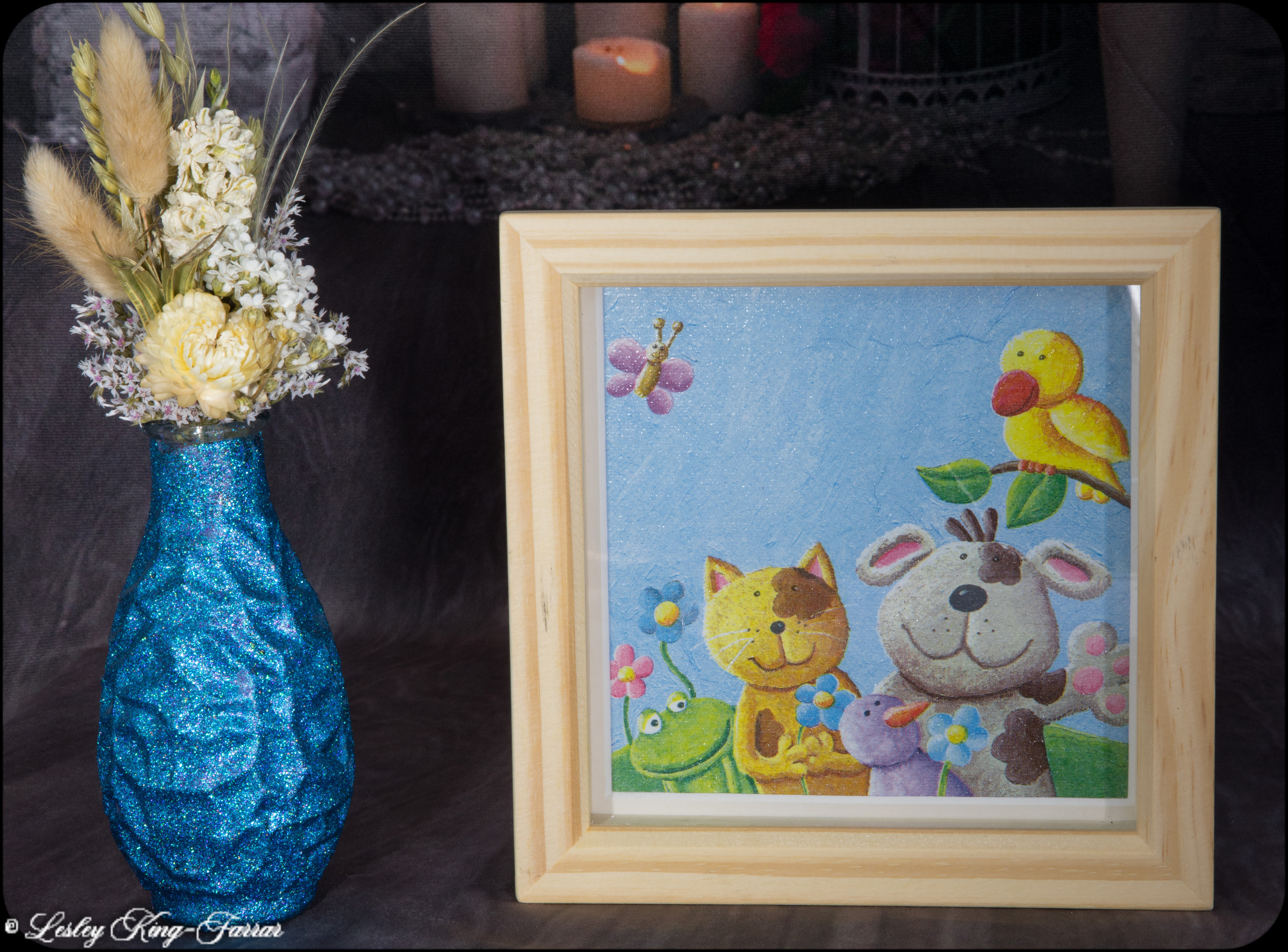 Delightful picture for childs Nursery or Bedroom. Decoupage onto Canvas board and framed in an unfinished wood frame ready for you to paint or embellish