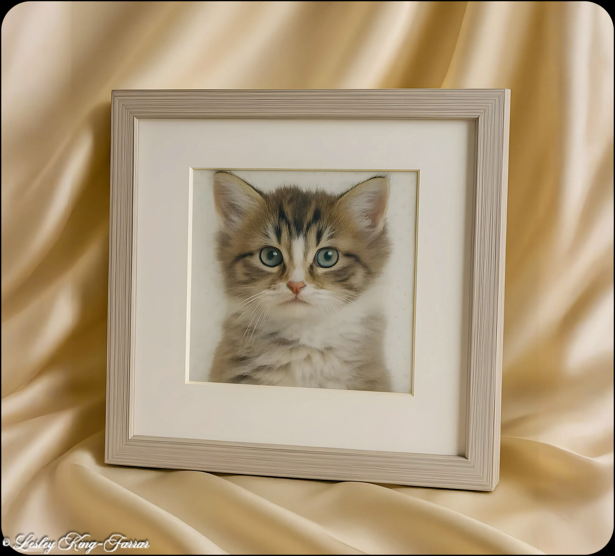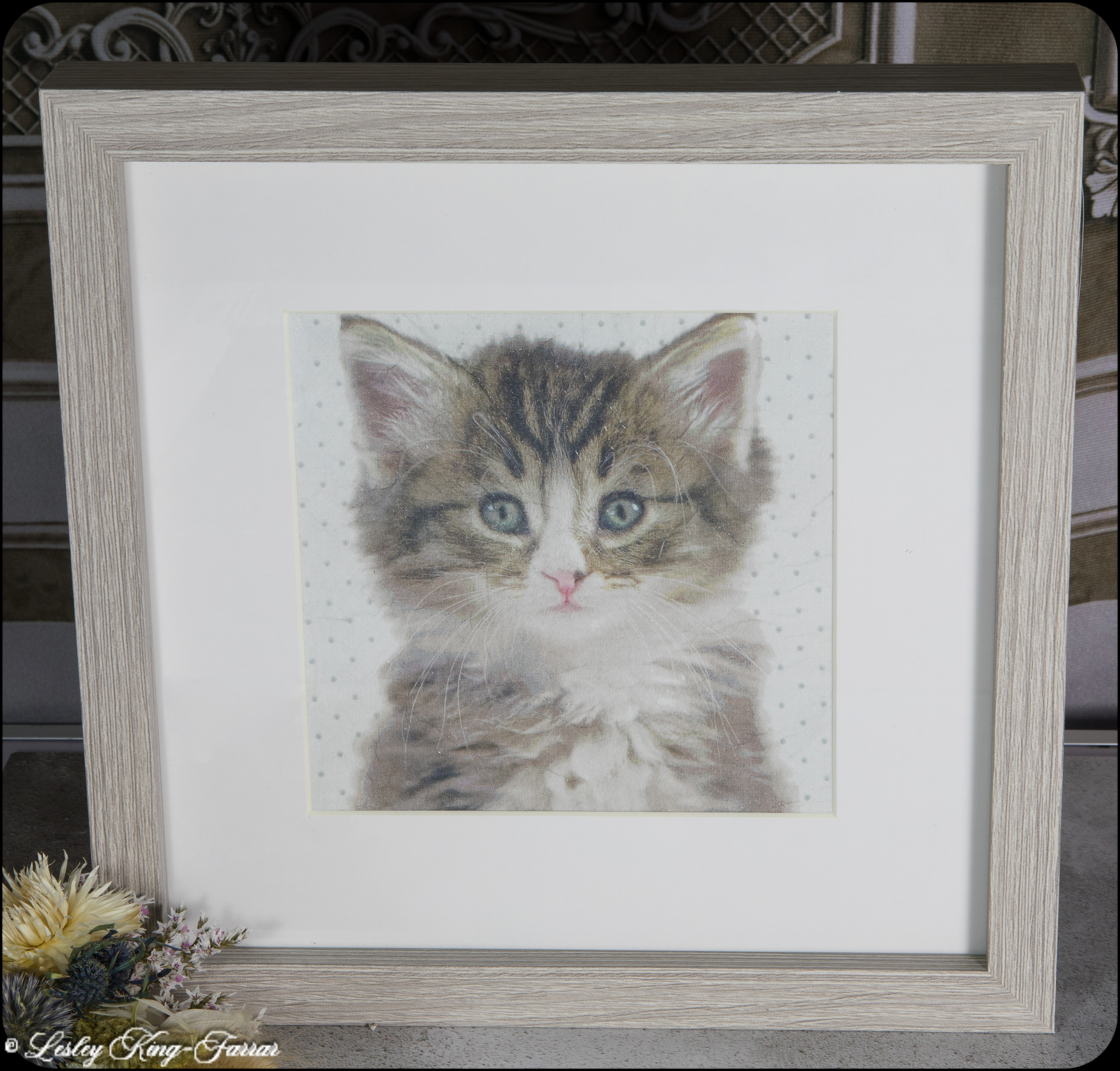 Bring warmth and charm into your home with this delightful decoupage picture of a fluffy tabby kitten on canvas. Beautifully displayed within an off-white mount and finished with a grey wood effect frame, this piece captures the playful innocence of a kitten in timeless style.