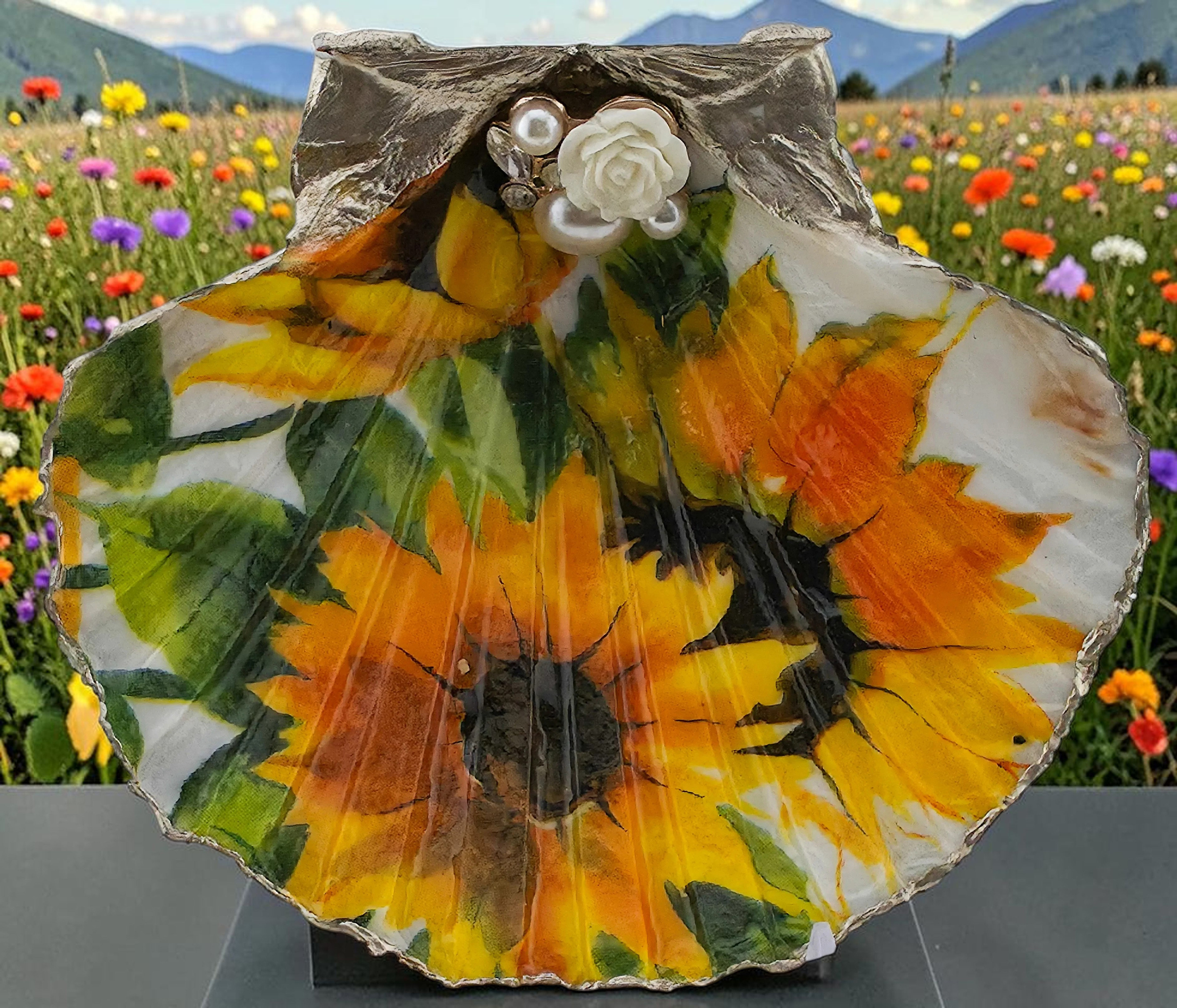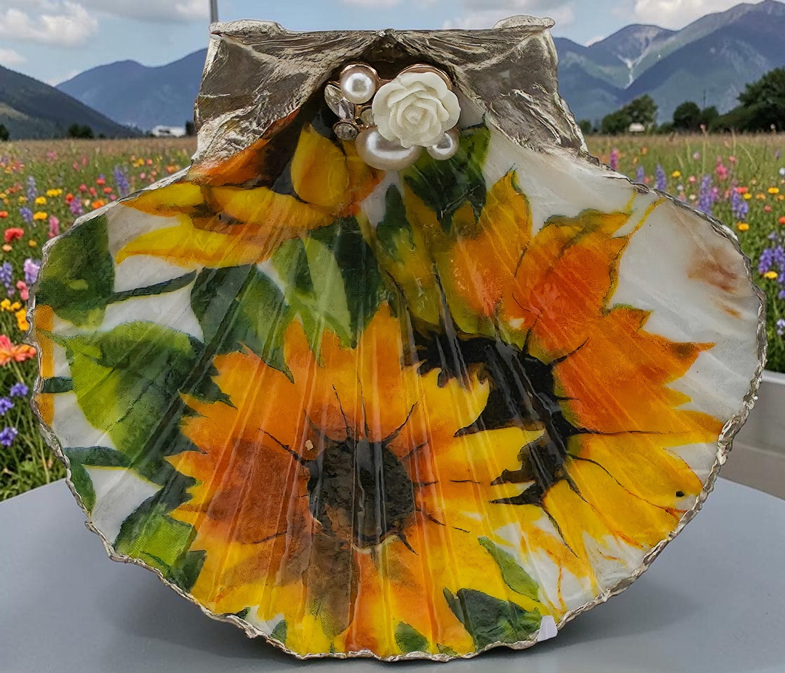 The interior is beautifully decoupaged with a vibrant sunflower design, symbolising warmth, happiness, and positivity. The outer shell is hand-painted in a soft platinum tone, adding a refined, luminous quality that enhances the shell’s natural contours.