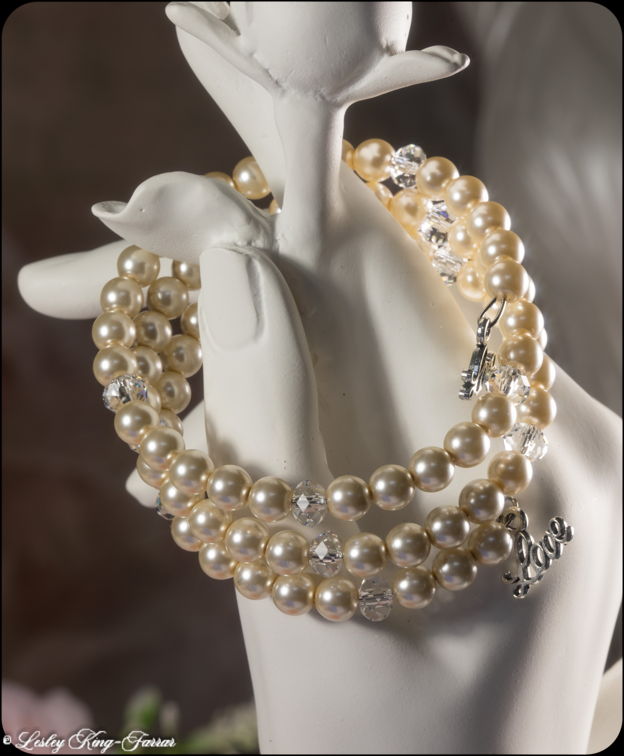 Beautiful Ivory colour Crystal Pearls with Sparkling Clear Crystals, finished at each end with charms with the word 'Love'. Just wrap around you wrist with no fiddly clasps