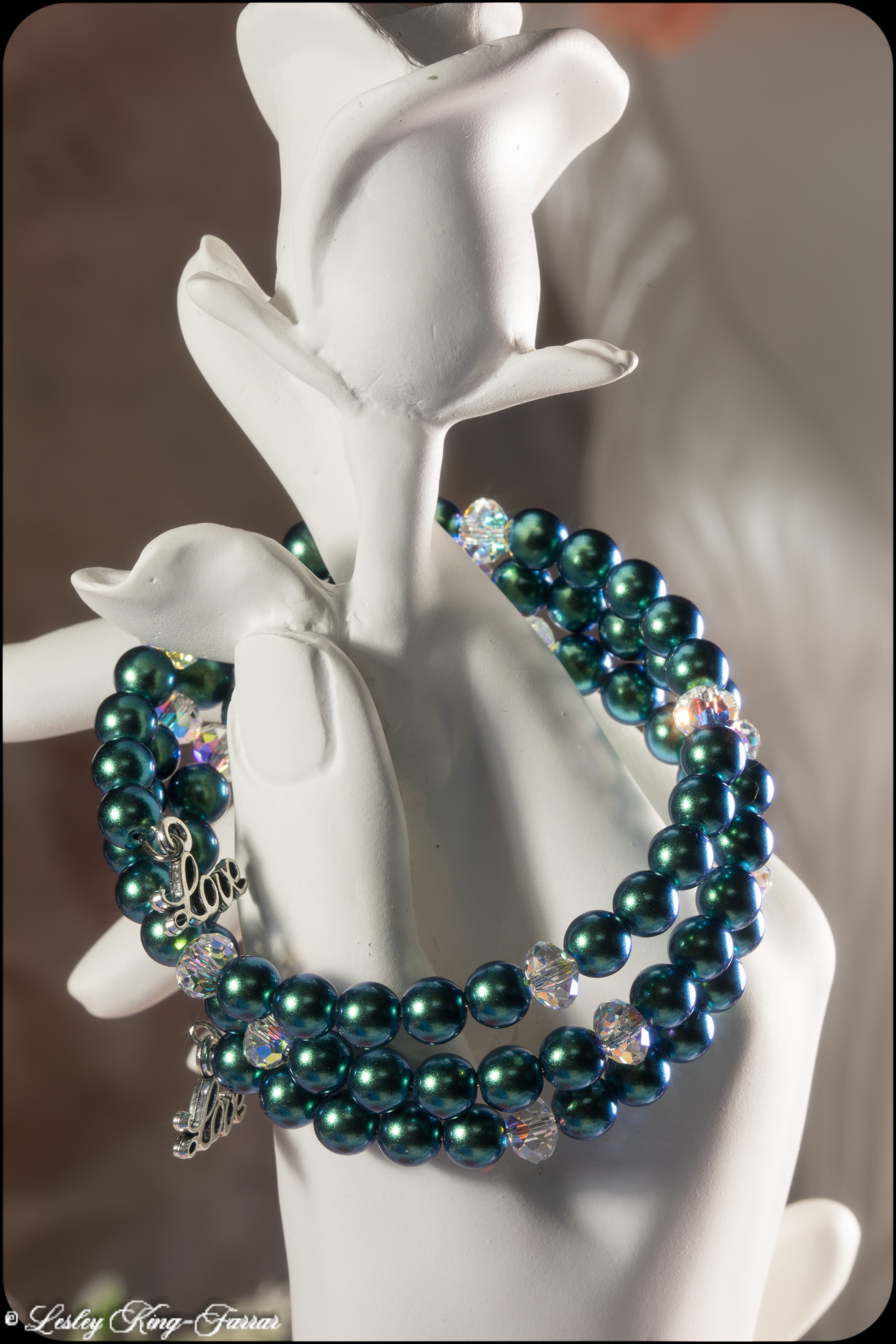 Lovely Pearlescent Peacock Blue, Preciosa Crystal Pearls with sparkling Aurora Borealis Crystals, finished at each end with a charm with the word 'Love'. Just wrap around your wrist and you're ready to go