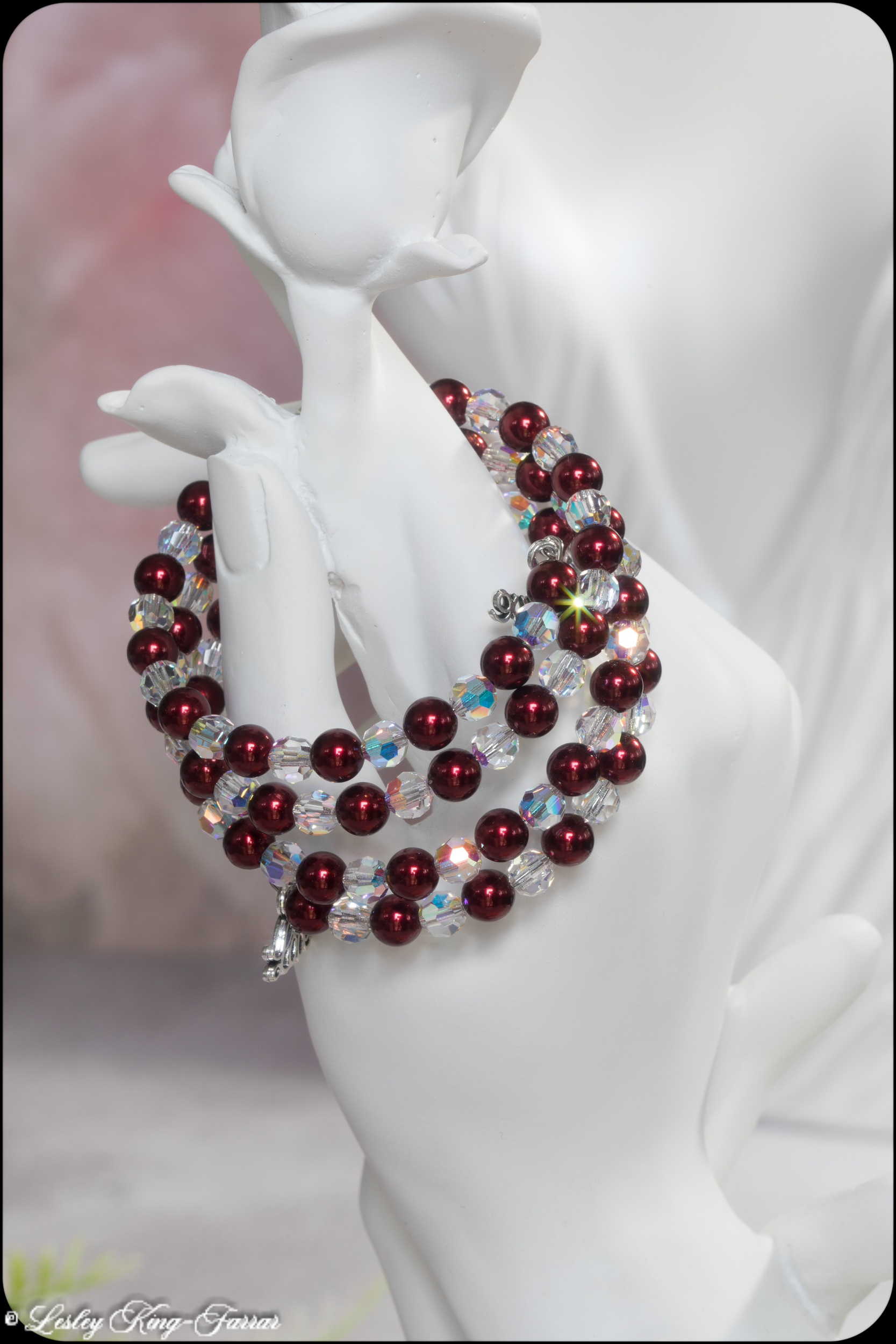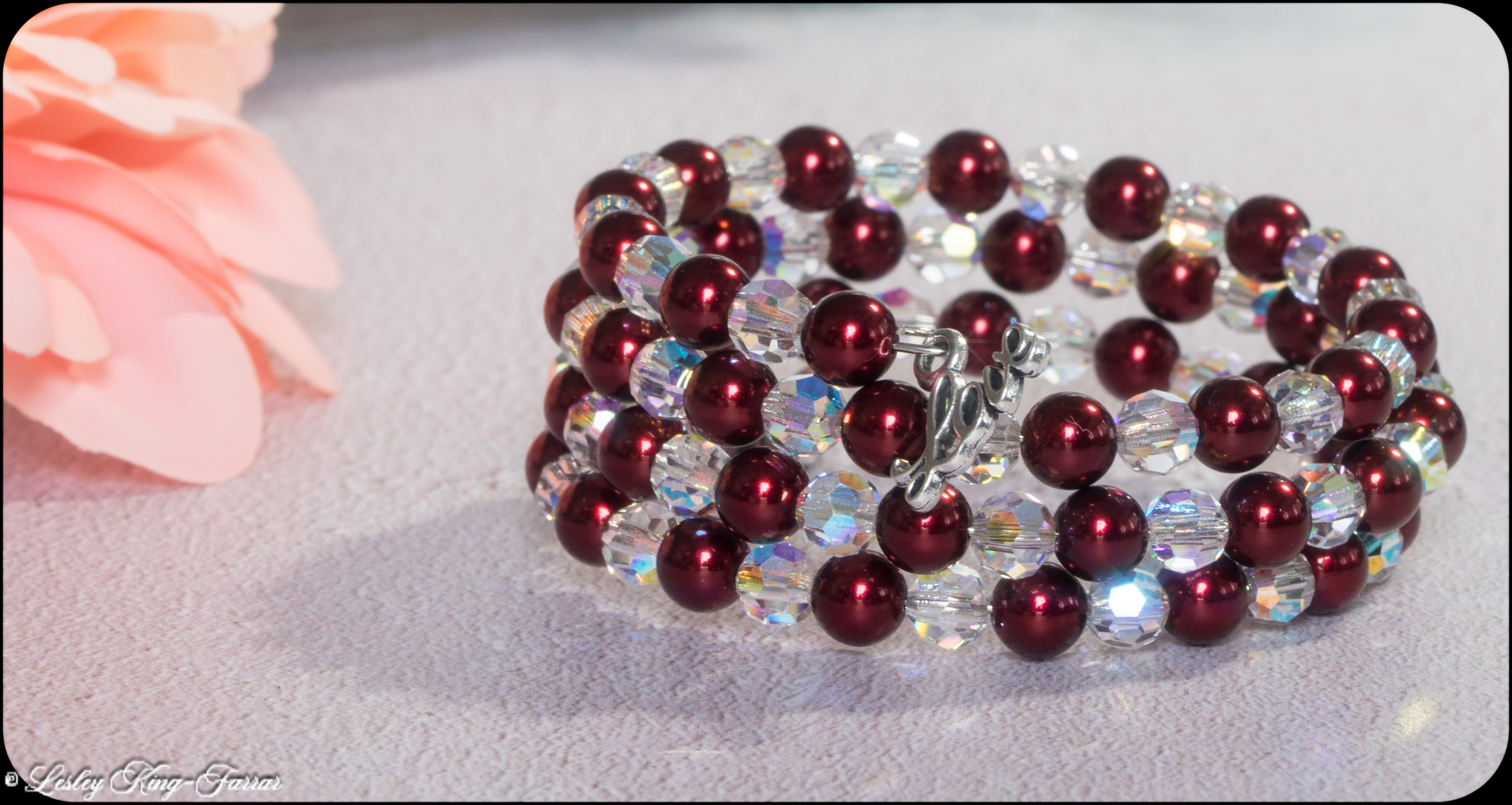 Beautiful Memory Wire wrap around bracelet with 6mm round deep Bordeaux Red Preciosa Crystal Pearls and shimmering Preciosa AB Crystals