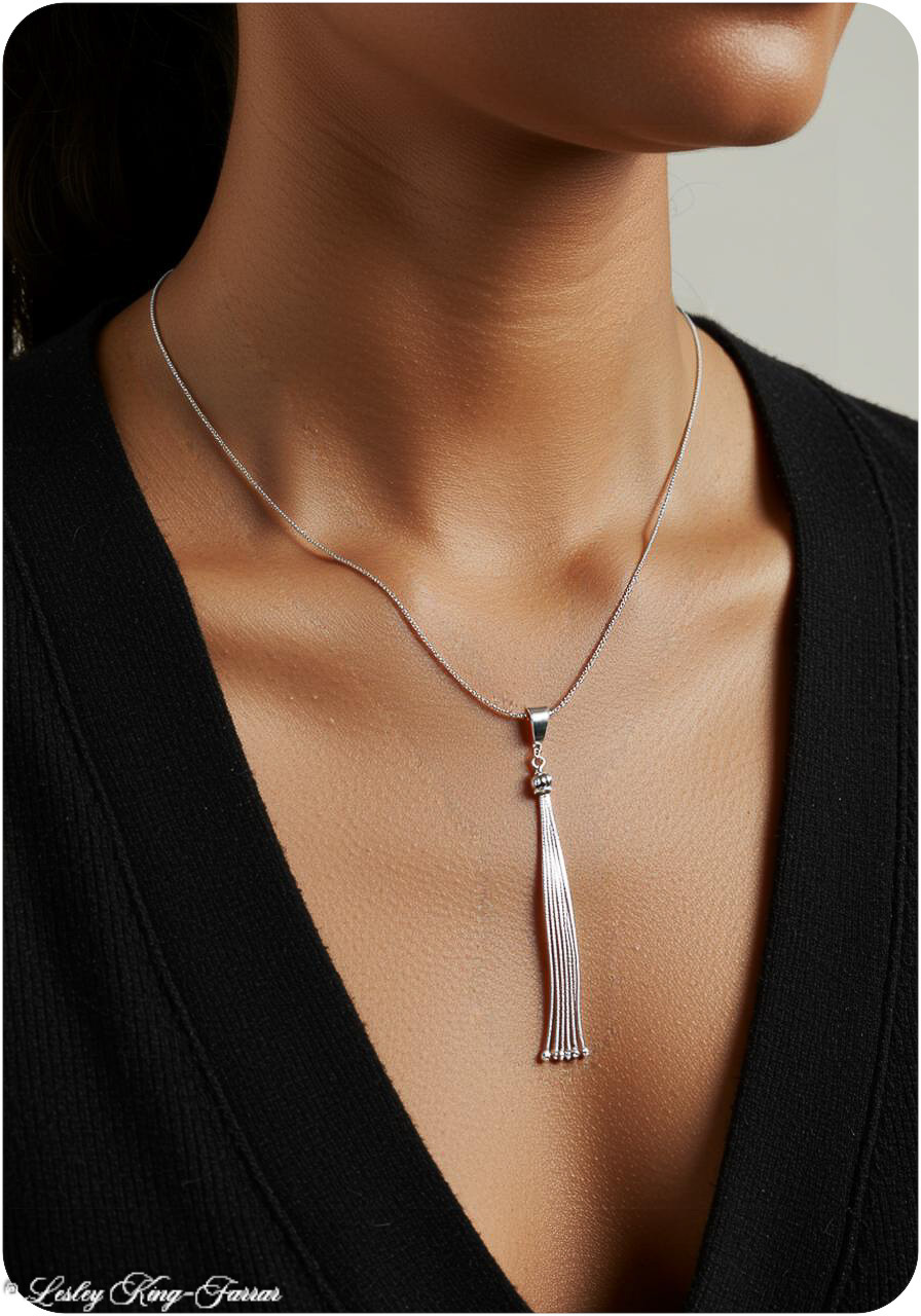 Add a touch of flowing elegance to your jewelry collection with our Sterling Silver Tassel Necklace. This eye-catching design features a sleek, 55mm tassel pendant crafted entirely from sterling silver, creating graceful movement and a subtle shimmer with every step.