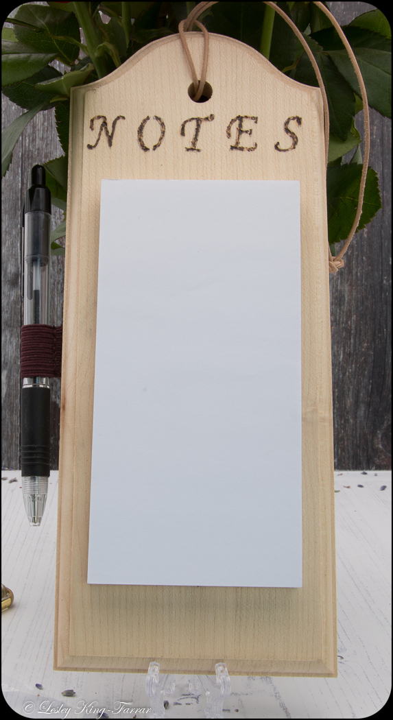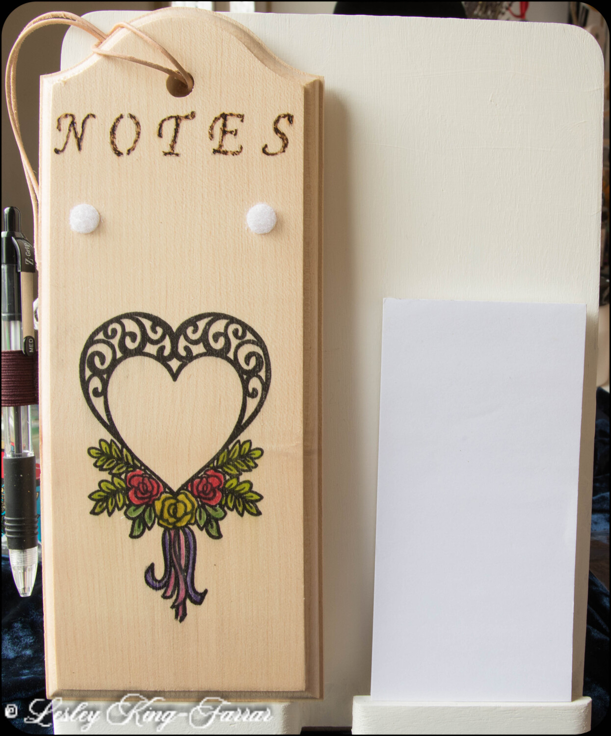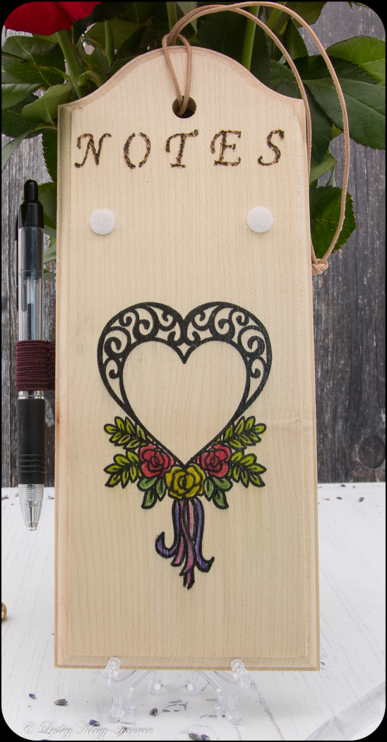Solid Sycamore Notepad Holder with attached pen and pad. Pretty flowered heart shows when the pad runs out, hand coloured, then lacquered to preserve the colours. Ready to hang with soft leather cord