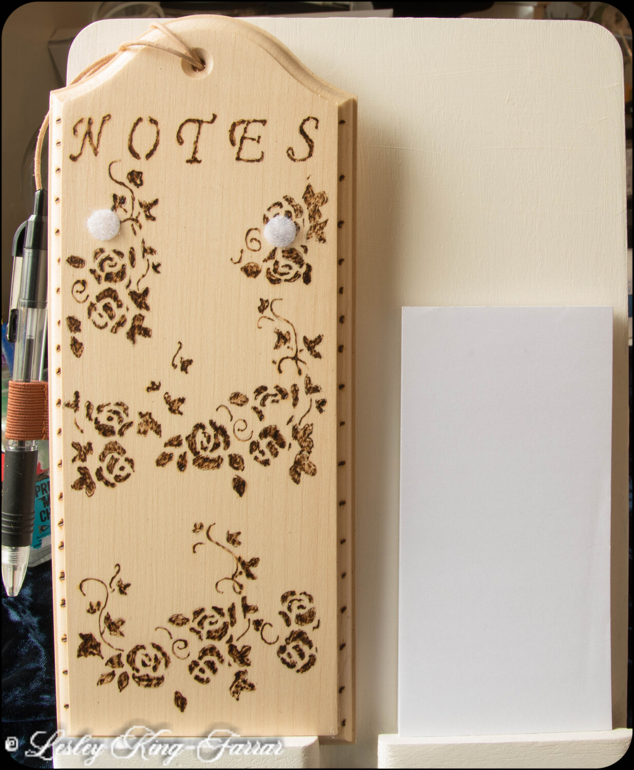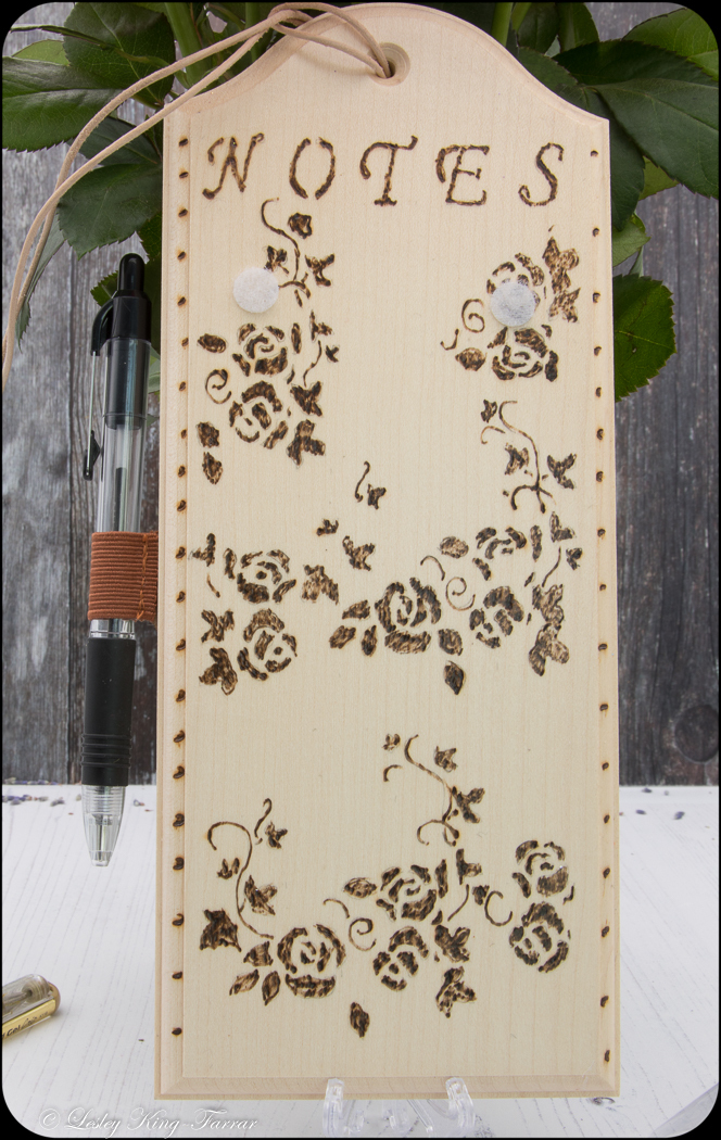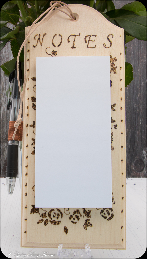 Pretty Notepad Holder with pen and notepad. Pyrography Roses & Vines decorate the front which has then been lacquered to preserve the wood, ready to hang from waxed cotton cord.