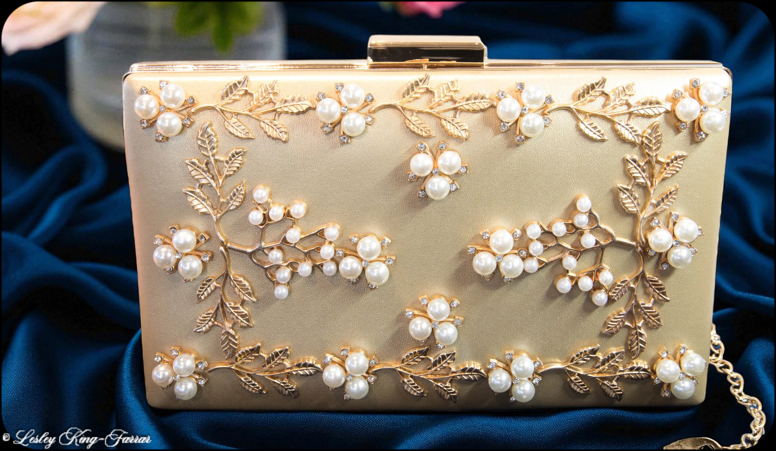 Make a statement at any special occasion with this faux gold box clutch evening bag, adorned with delicate pearl and crystal flower and leaf embellishments. Crafted on a luxurious gold leather-look fabric, this elegant clutch features a gold-coloured frame and clasp with a rich yellow-gold interior.