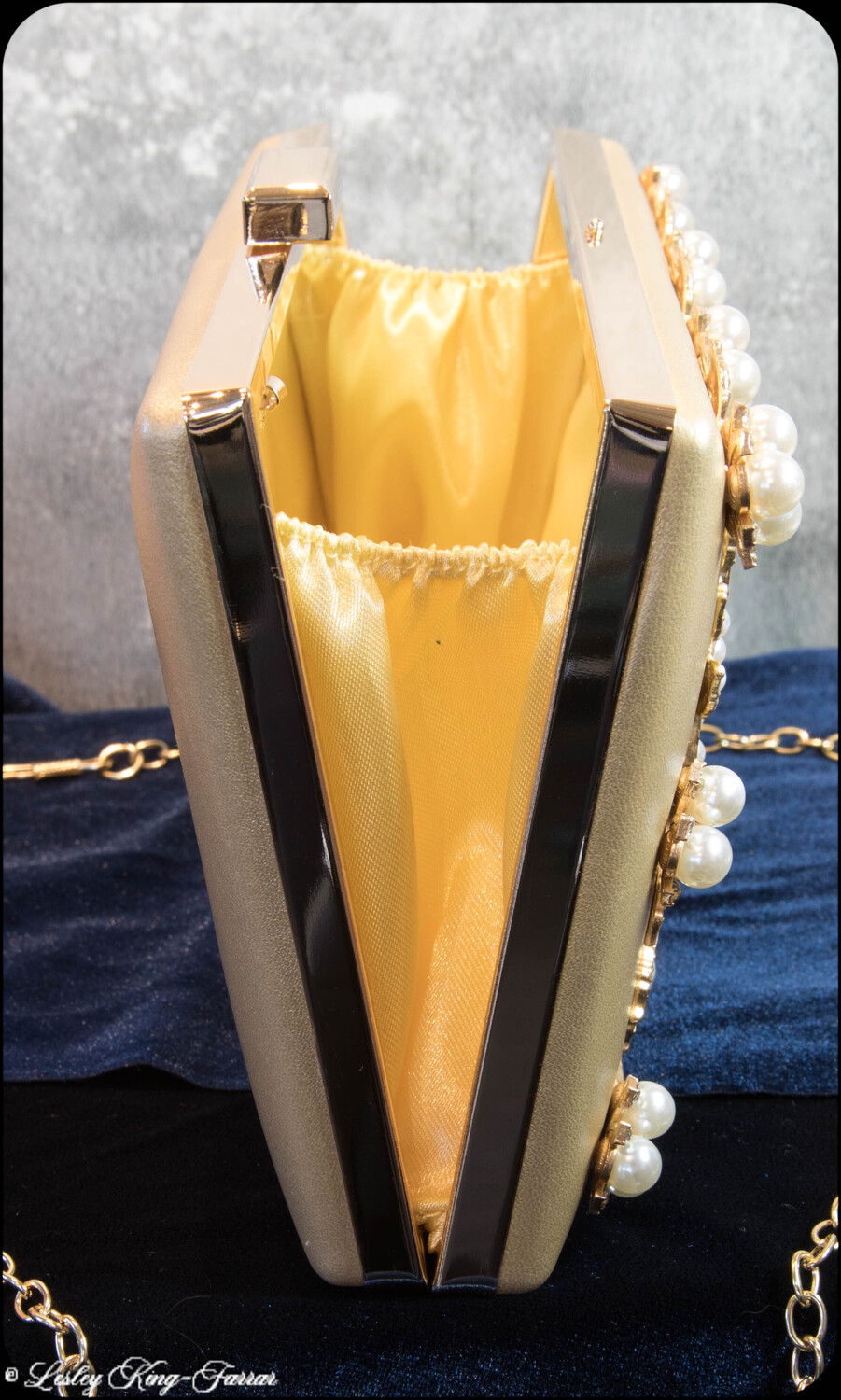 Designed with versatility in mind, the bag includes a detachable strap, allowing it to be worn as a shoulder bag or carried as a chic clutch. Measuring 20cm wide x 12cm high (excluding clasp) x 3cm deep closed, it’s perfectly sized for evening essentials like your phone, lipstick, and keys.