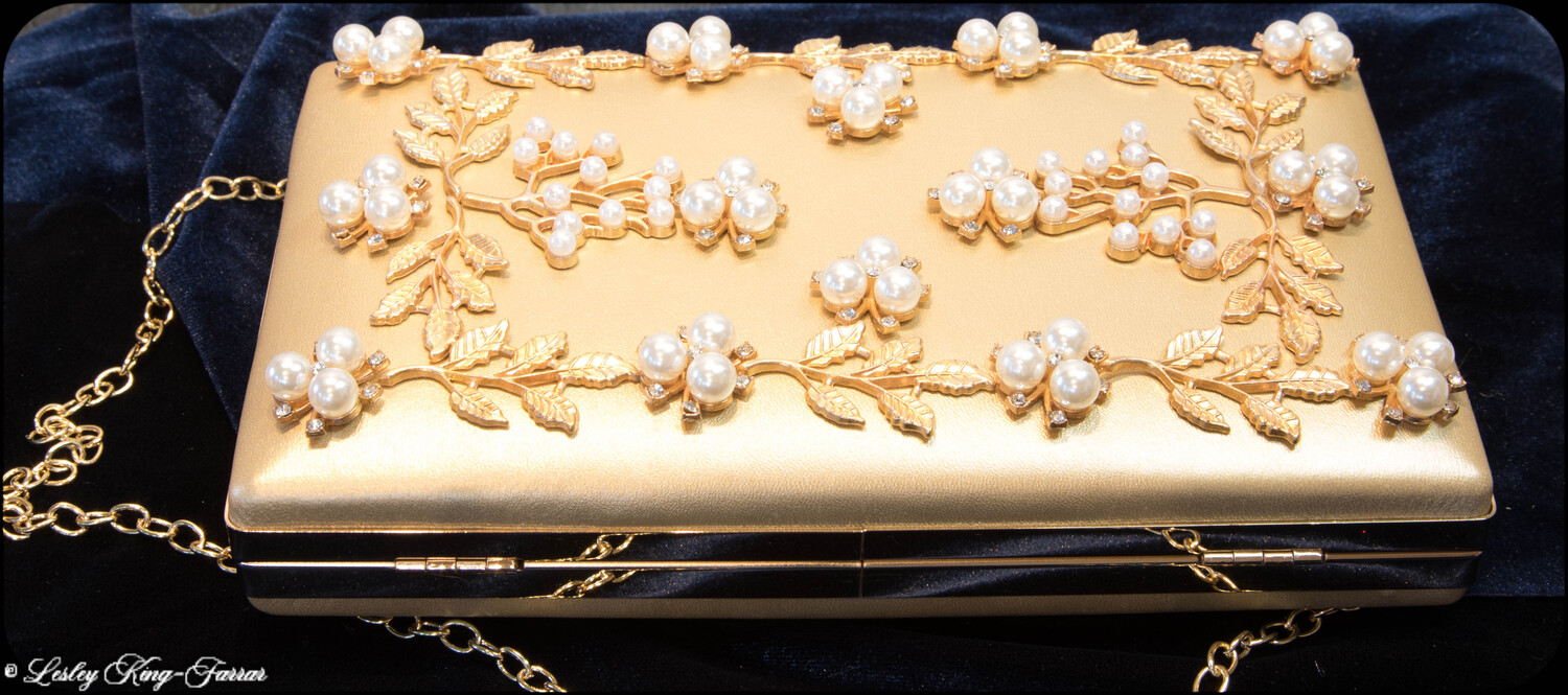 Faux Gold, Pearl & Crystal Embellished Box Clutch