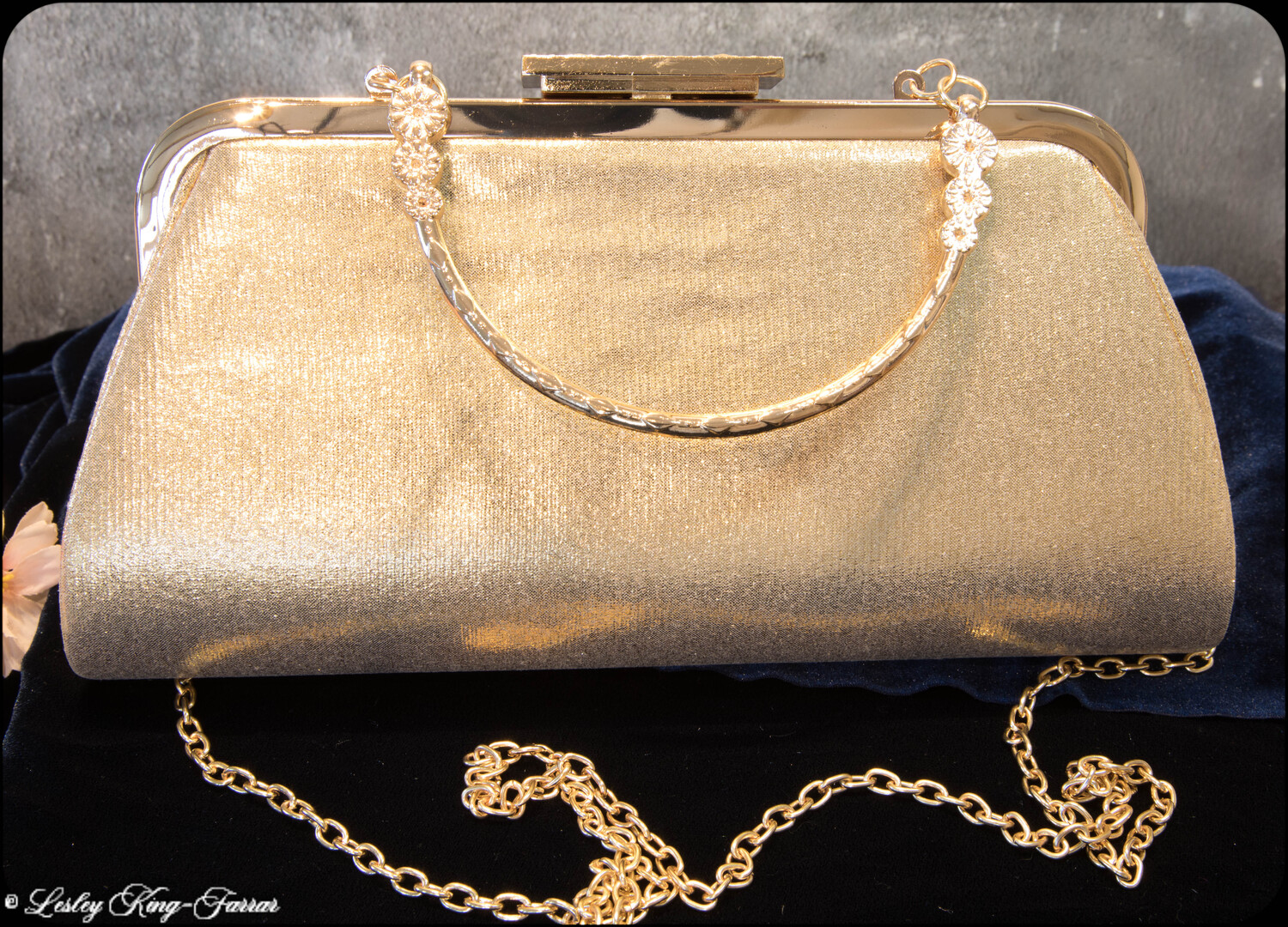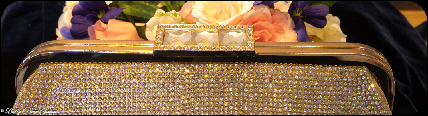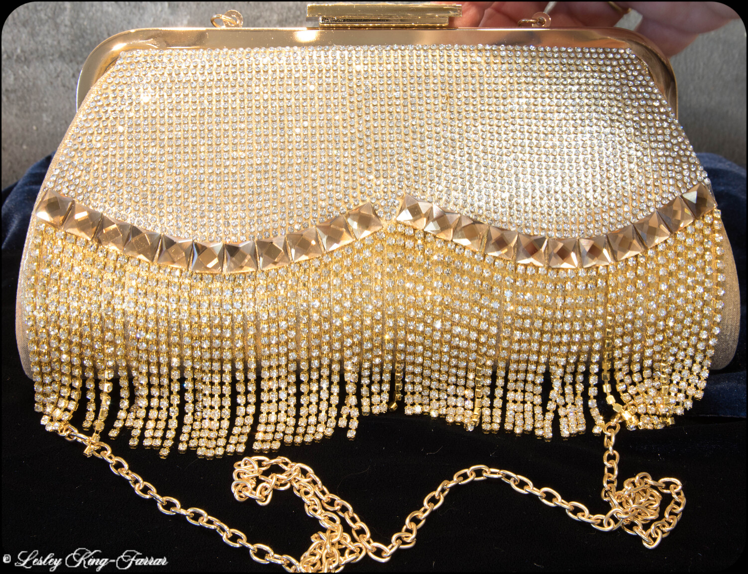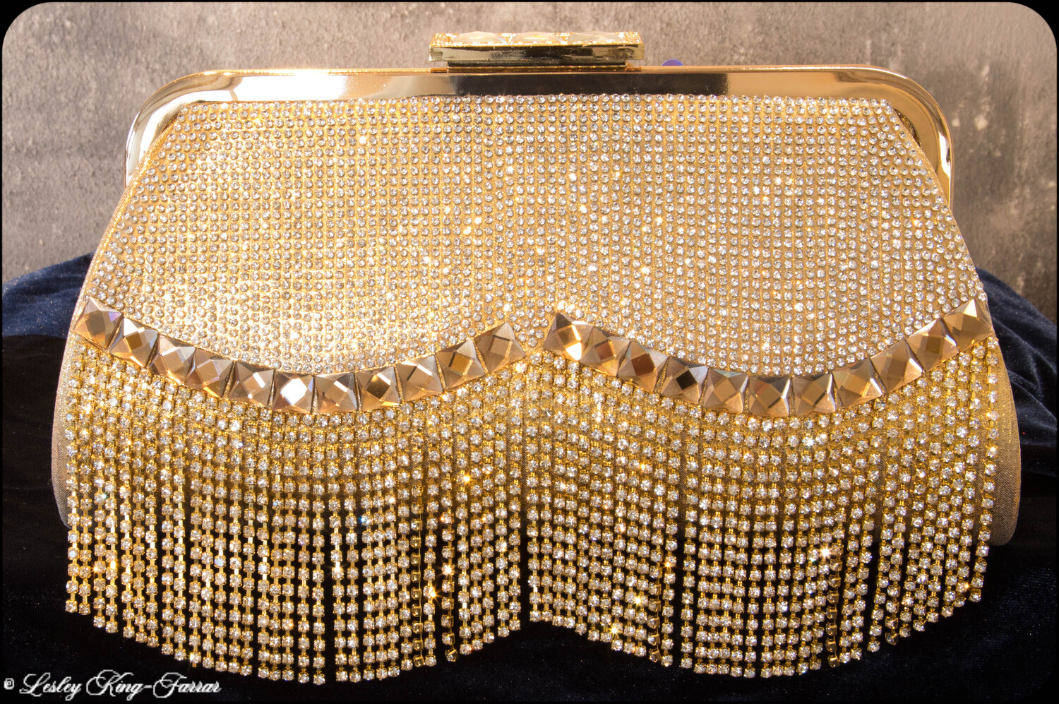 Beautiful elegant Clutch Bag adorned with silver crystal diamantes on a rich gold background. The lovely tassles hang below a row of contrasting copper coloured crystals. The front is fully embellished whilst the back is left plain, the clasp is finished with 3 clear crystals