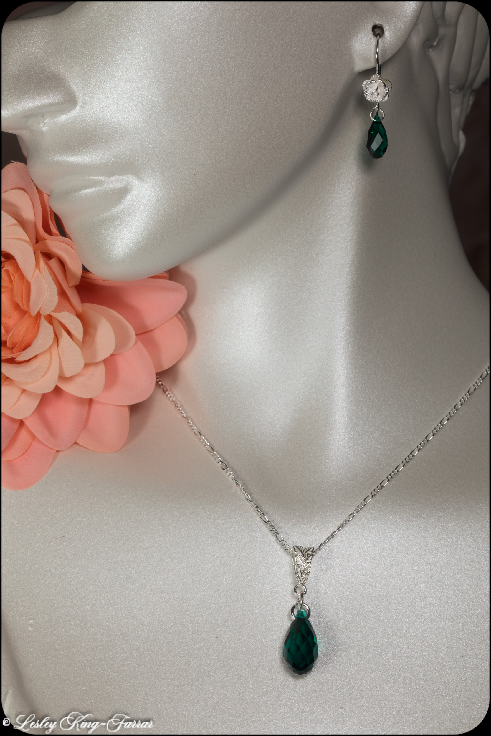 Beautiful Emerald Green Serinity Crystal and Sterling Silver Necklace & Rose Earring Set will complement any outfit day or night