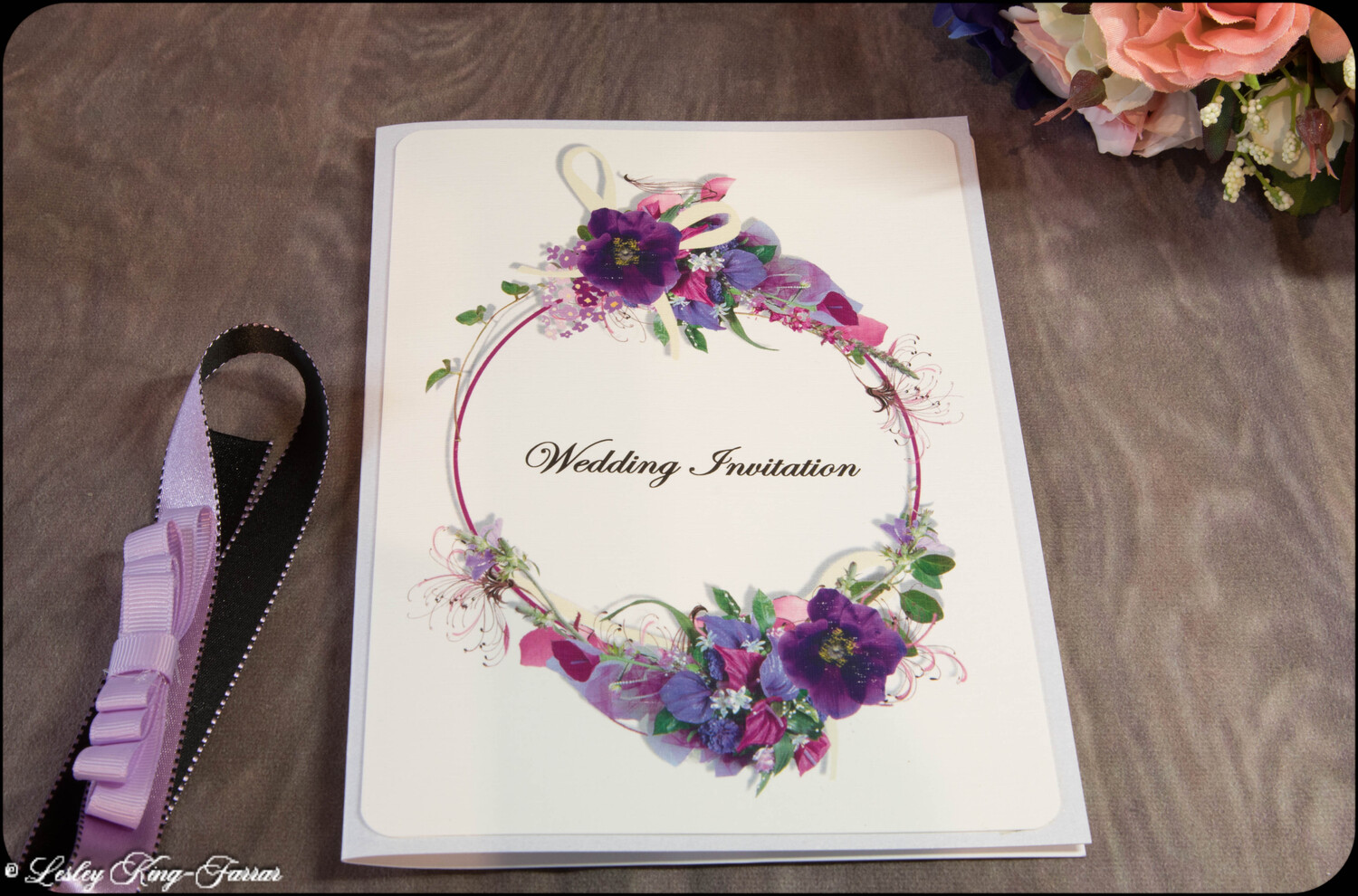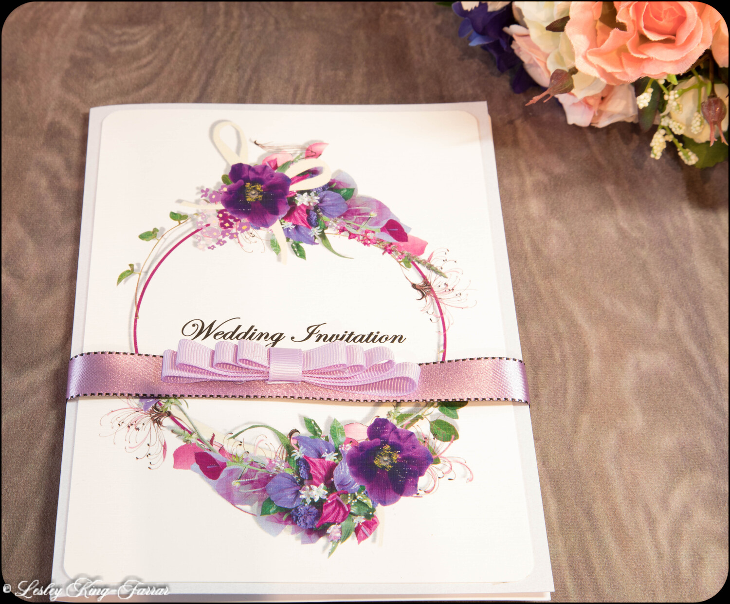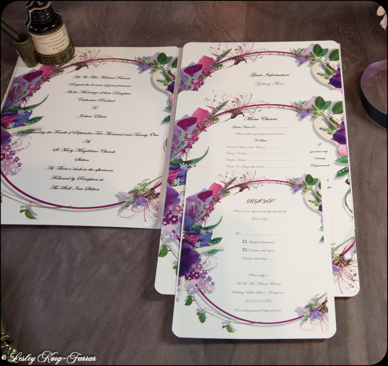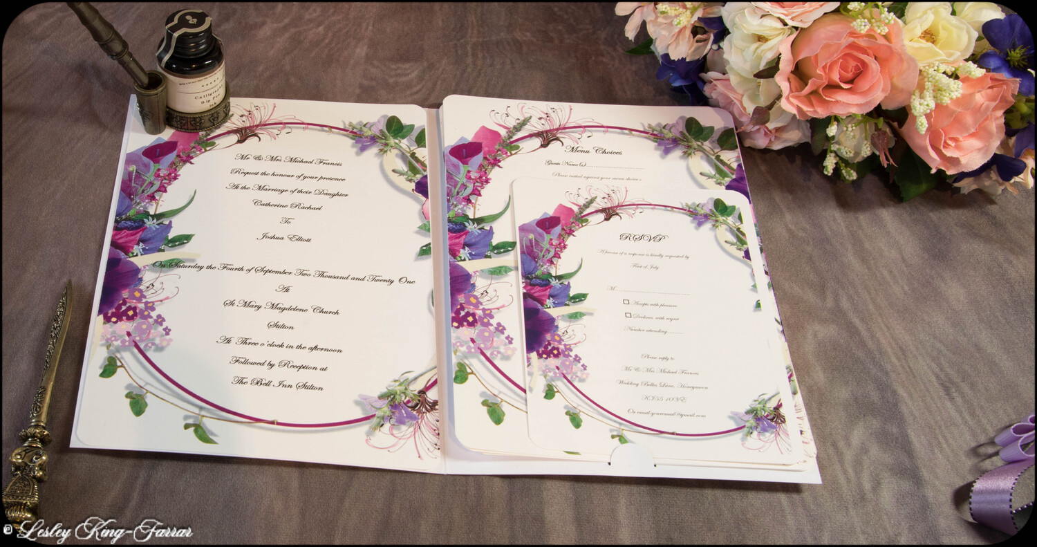 'Say it with flowers' Wedding Invitations are beautifully colourful, finished with your choice of colour ribbon and handmade Tiffany Bow . This full Suite offers you, your Wedding Invitation with envelopes, RSVP with envelope, with return address printed on if required, your Menu Choices, Guest Information 'Accommodation & Taxis and Guest Information 'Getting There'.