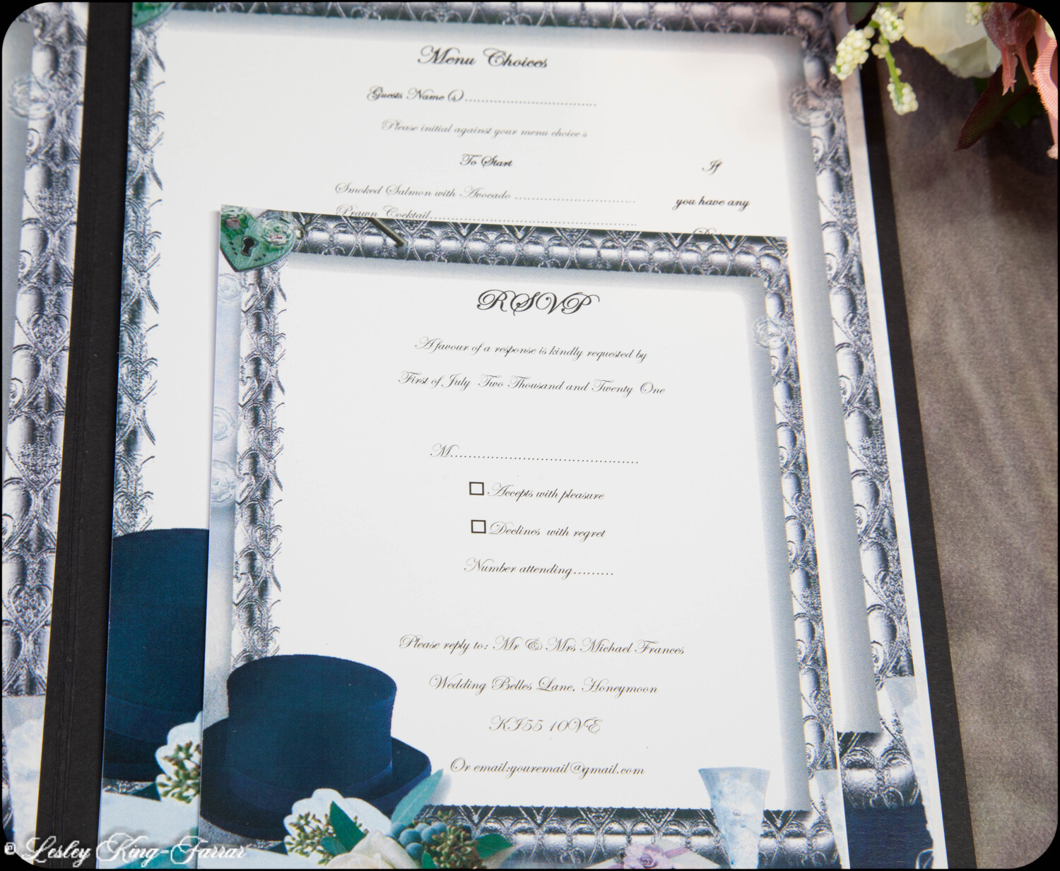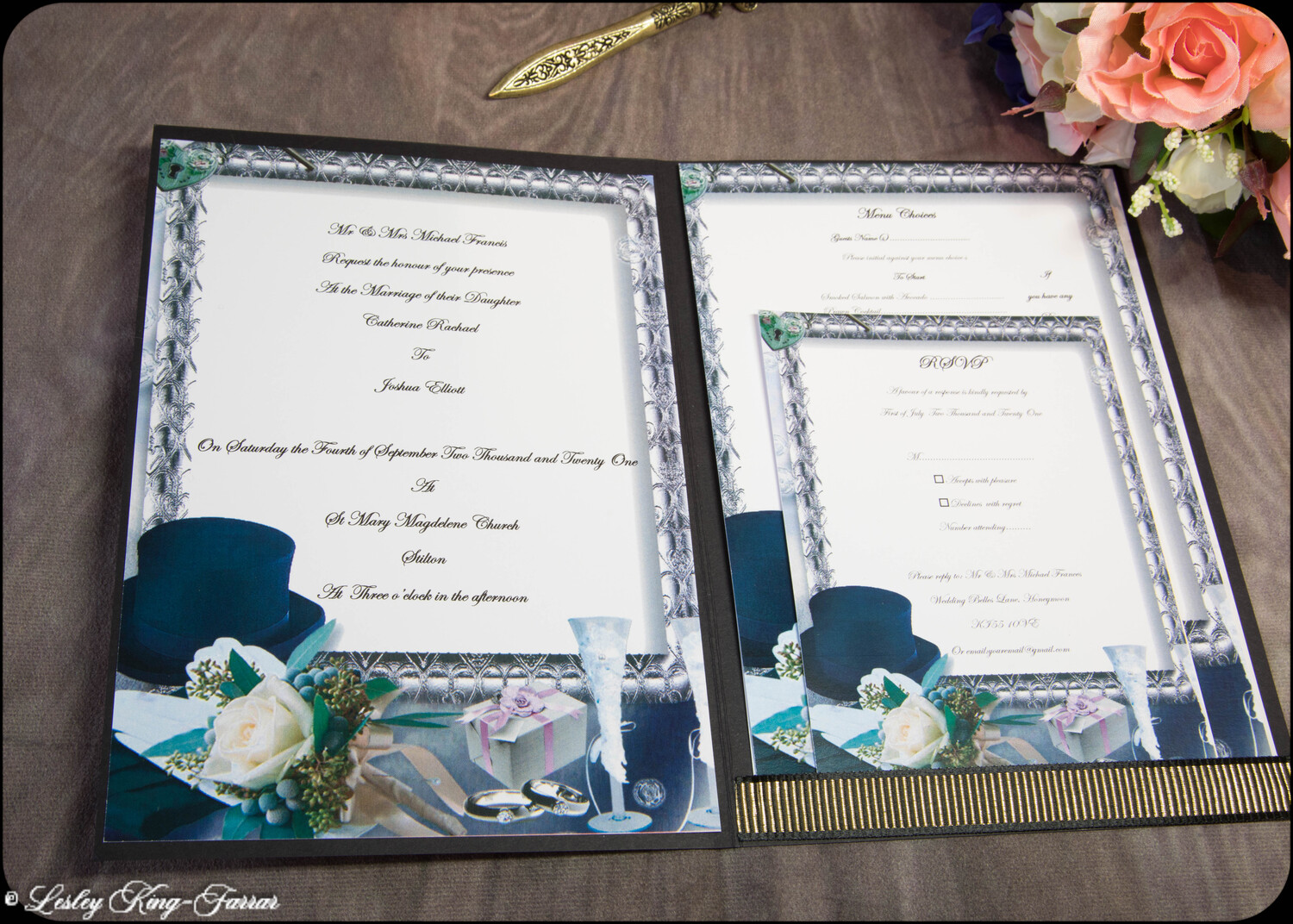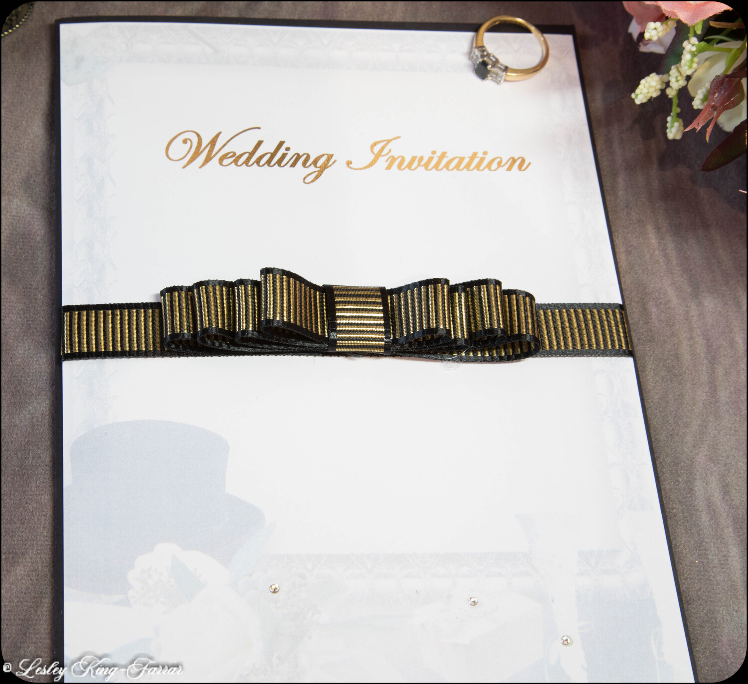 Our Top Hats & Roses Wedding Invitations add a little touch of luxury. Finished with Swarovski© or Preciosa© Crystals, a handmade Tiffany Bow and gold foiled words 'Wedding Invitation' . This full Suite offers you, your Wedding Invitation with envelopes, RSVP with envelope, with return address printed on if required, your Menu Choices, Guest Information 'Accommodation & Taxis and Guest Information 'Getting There'.