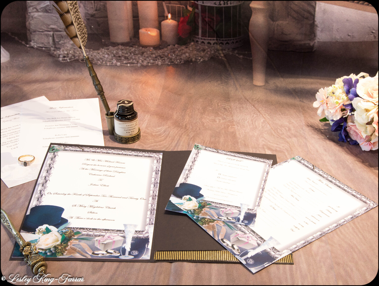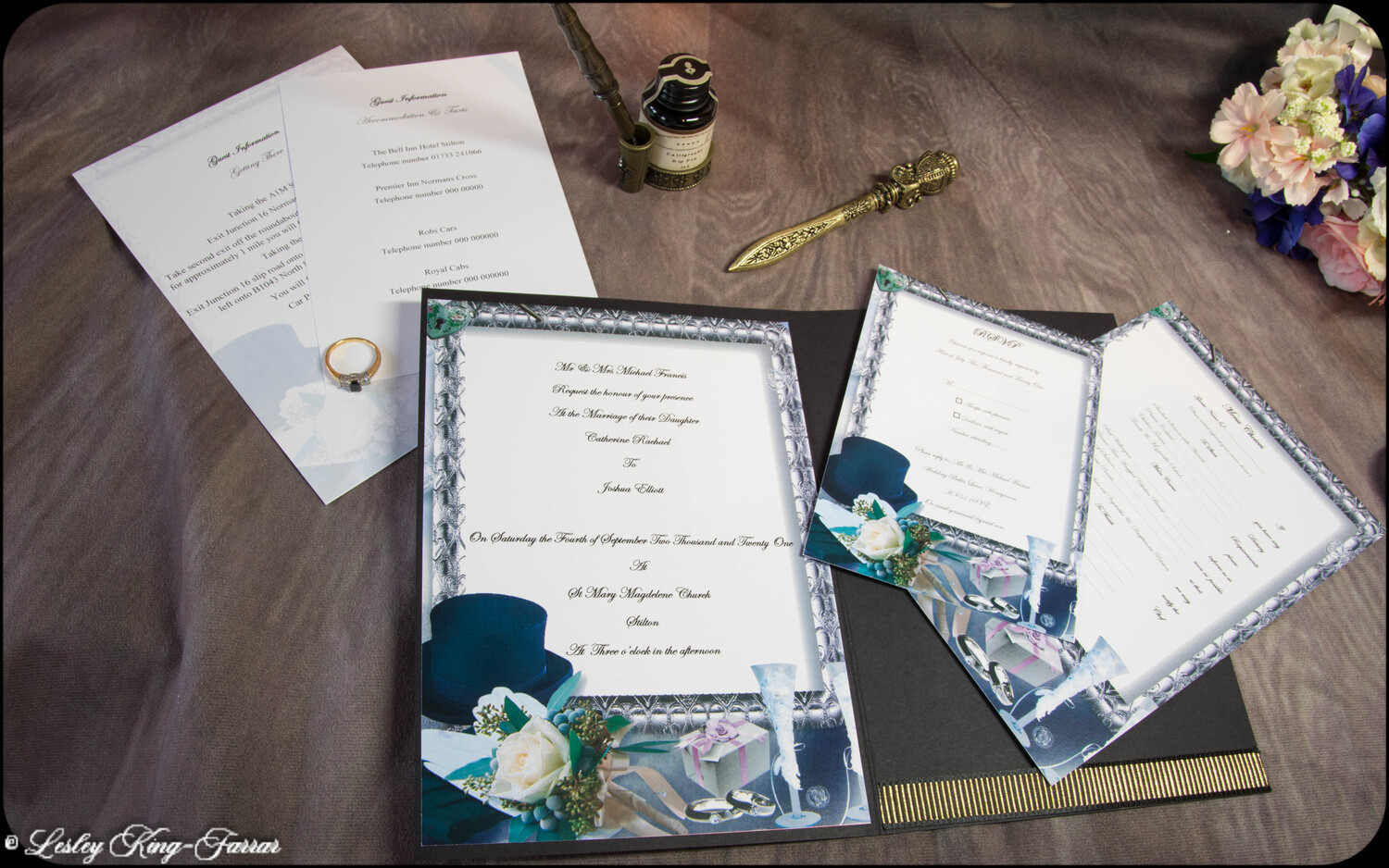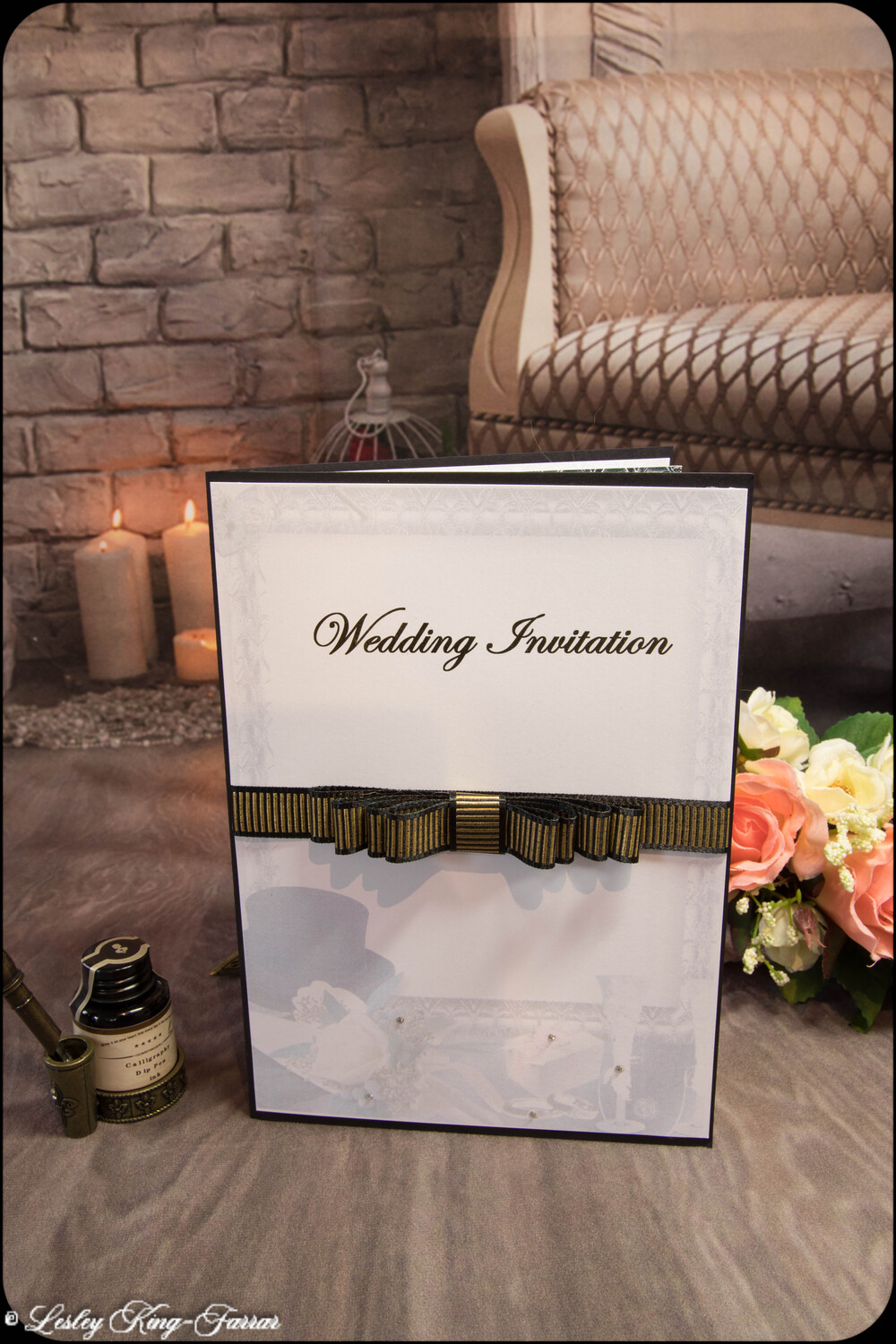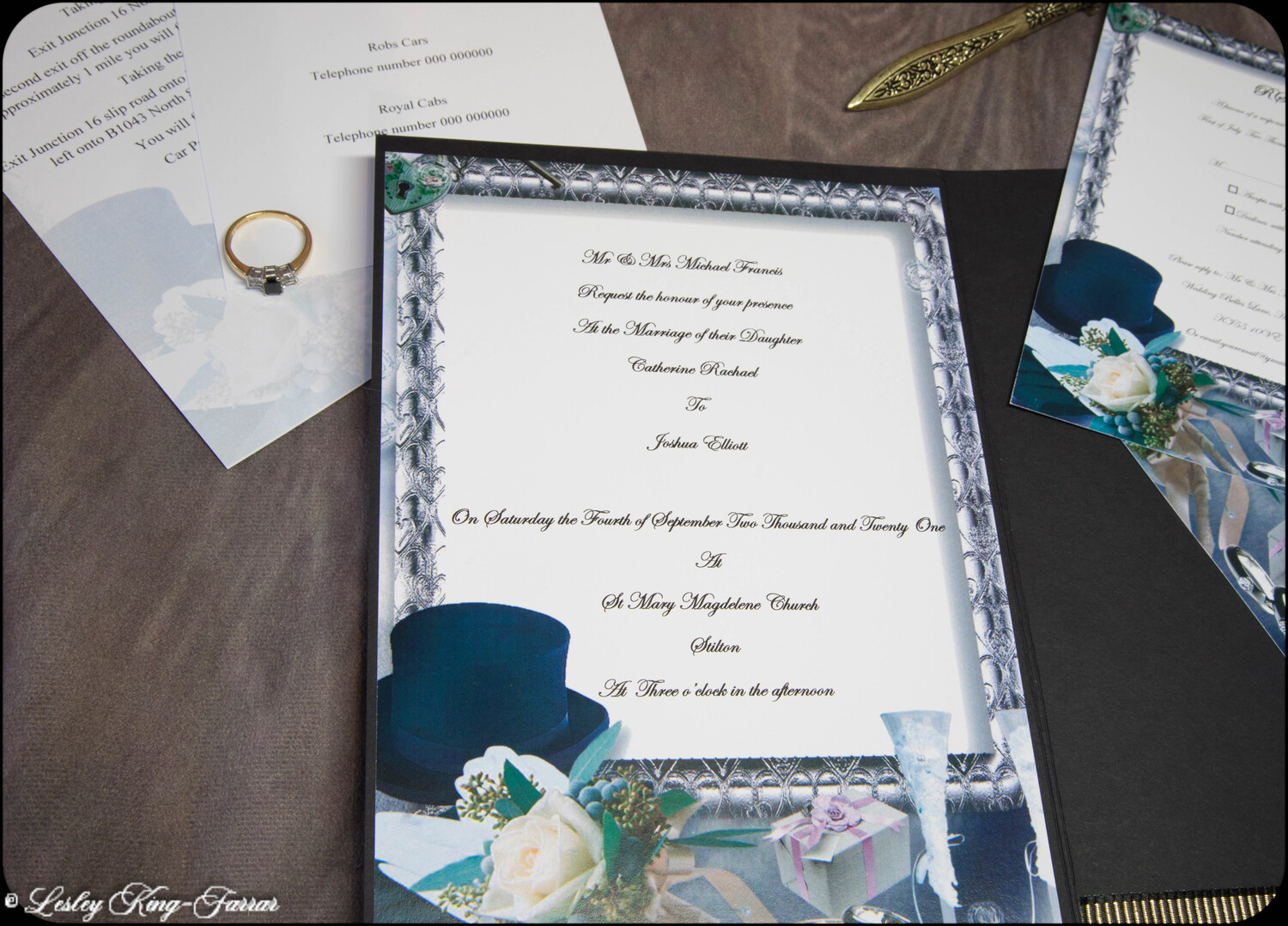 Our Top Hats & Roses Wedding Invitations add a little touch of luxury. Finished with Swarovski© or Preciosa© Crystals, a handmade Tiffany Bow and gold foiled words 'Wedding Invitation' . This full Suite offers you, your Wedding Invitation with envelopes, RSVP with envelope, with return address printed on if required, your Menu Choices, Guest Information 'Accommodation & Taxis and Guest Information 'Getting There'.