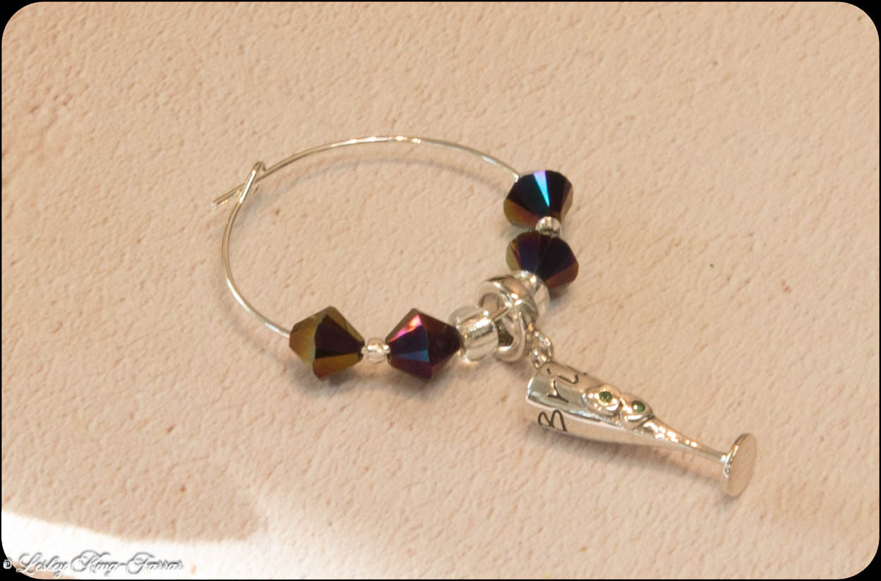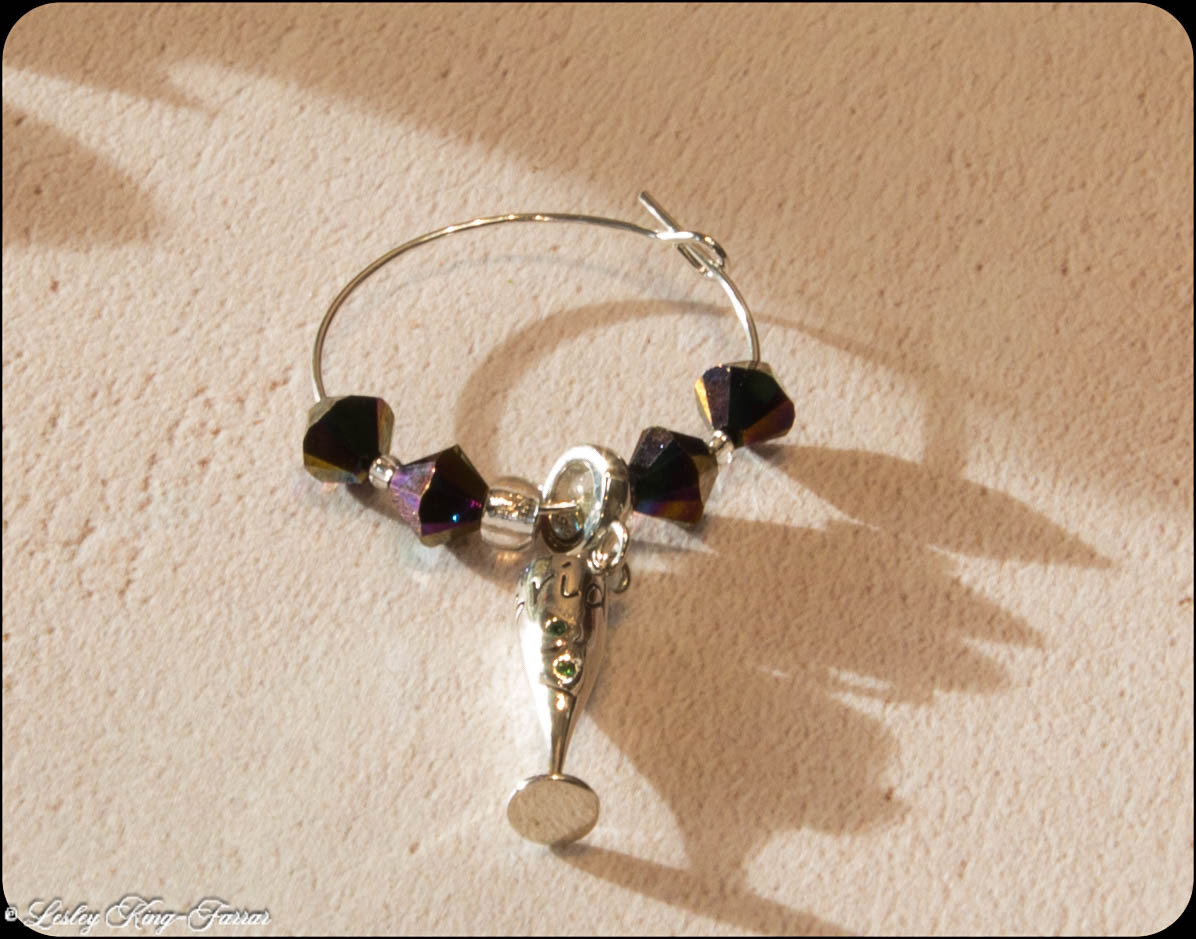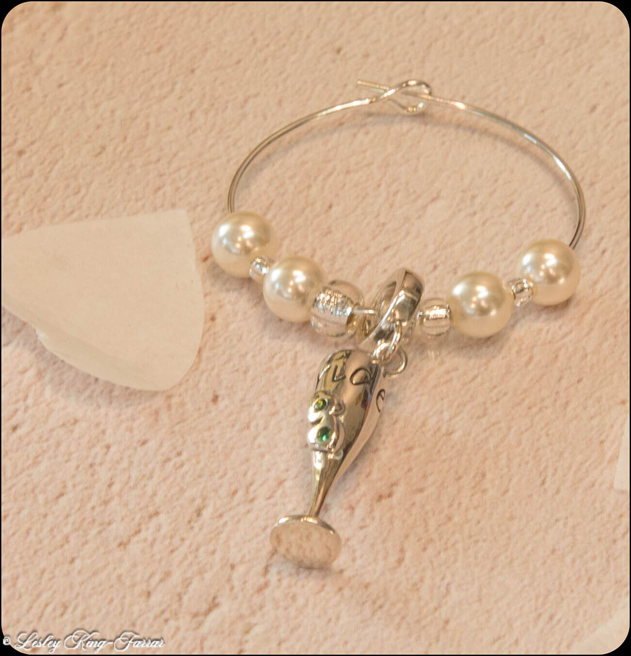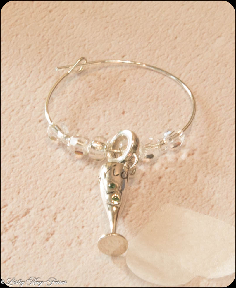 This super Sterling Silver Champagne Bottle Charm swings from a silver plated wine glass ring threaded with crystals from Swarovski© The Charm can easily be removed and placed directly onto a Charm Bracelet