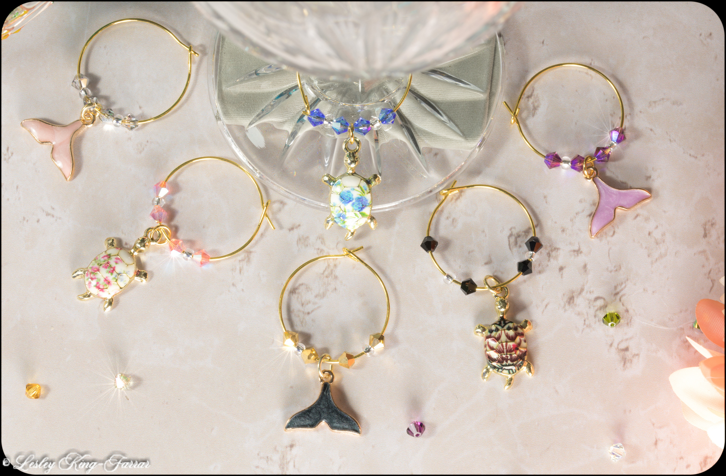 Set of 6 Colourful Enamel Turtles & Whale Tail Wine Glass Charms