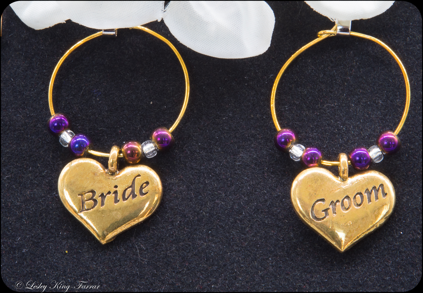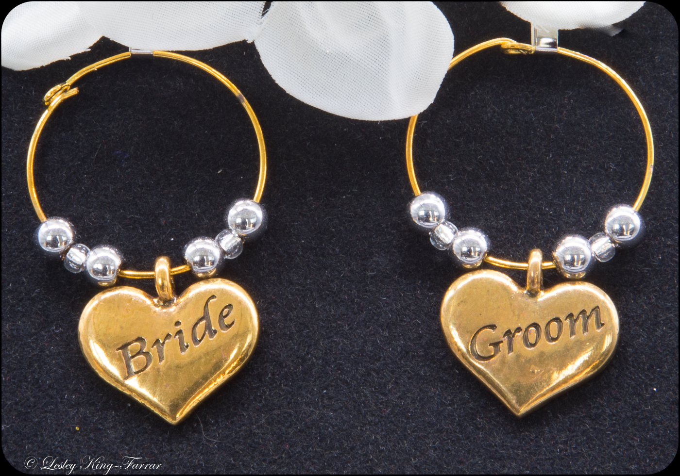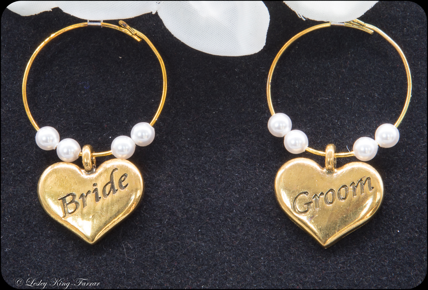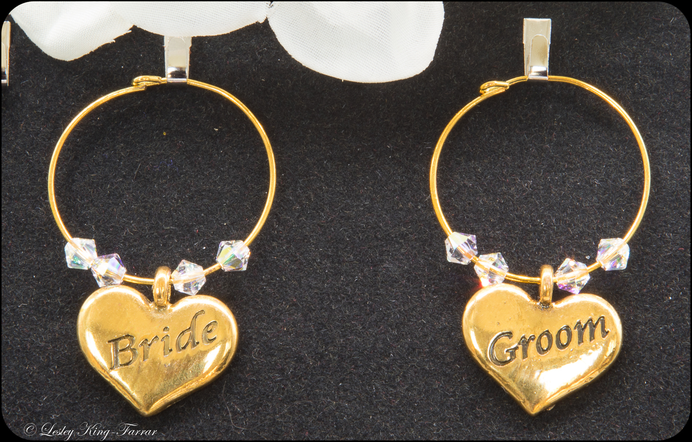 Lovely rich brass Bride & Groom Wine glass charms using Crystal Pearls or sparkling Crystals