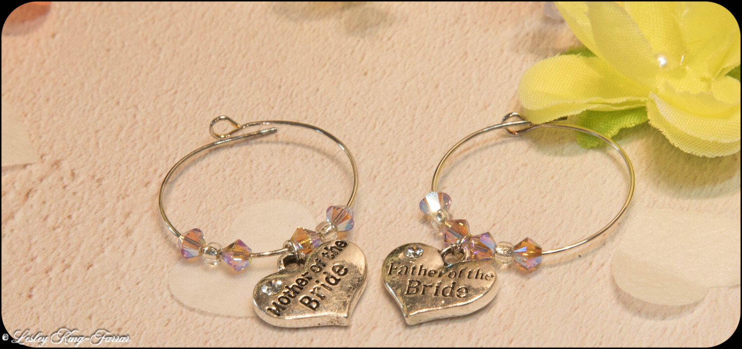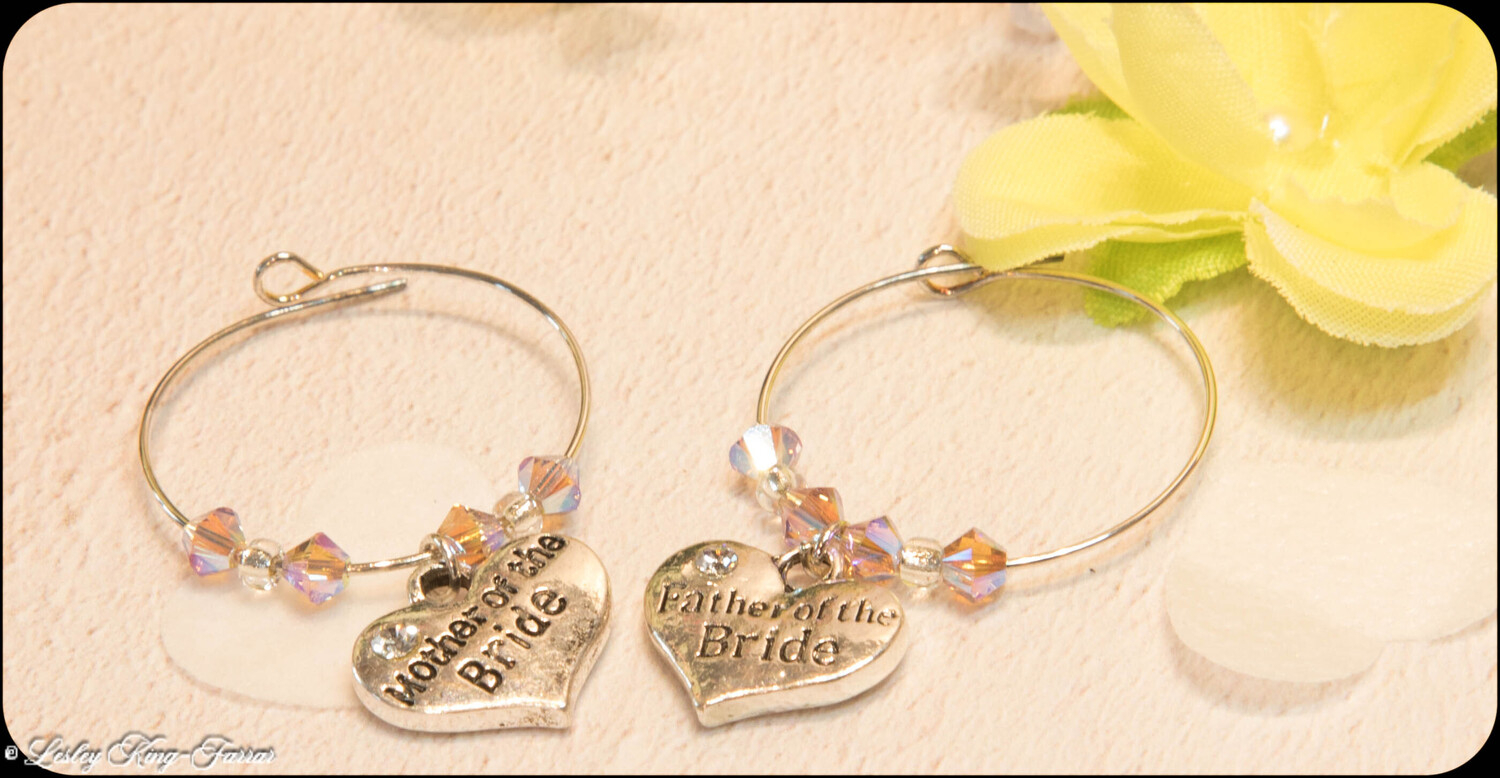 Mother & Father of the Bride, Wine Glass Charms. Handmade using Crystals from Preciosa these make a lovely simple table gift to place on their respective glasses so that they may easily identify whos is whos, no more putting your glass down and loosing it....