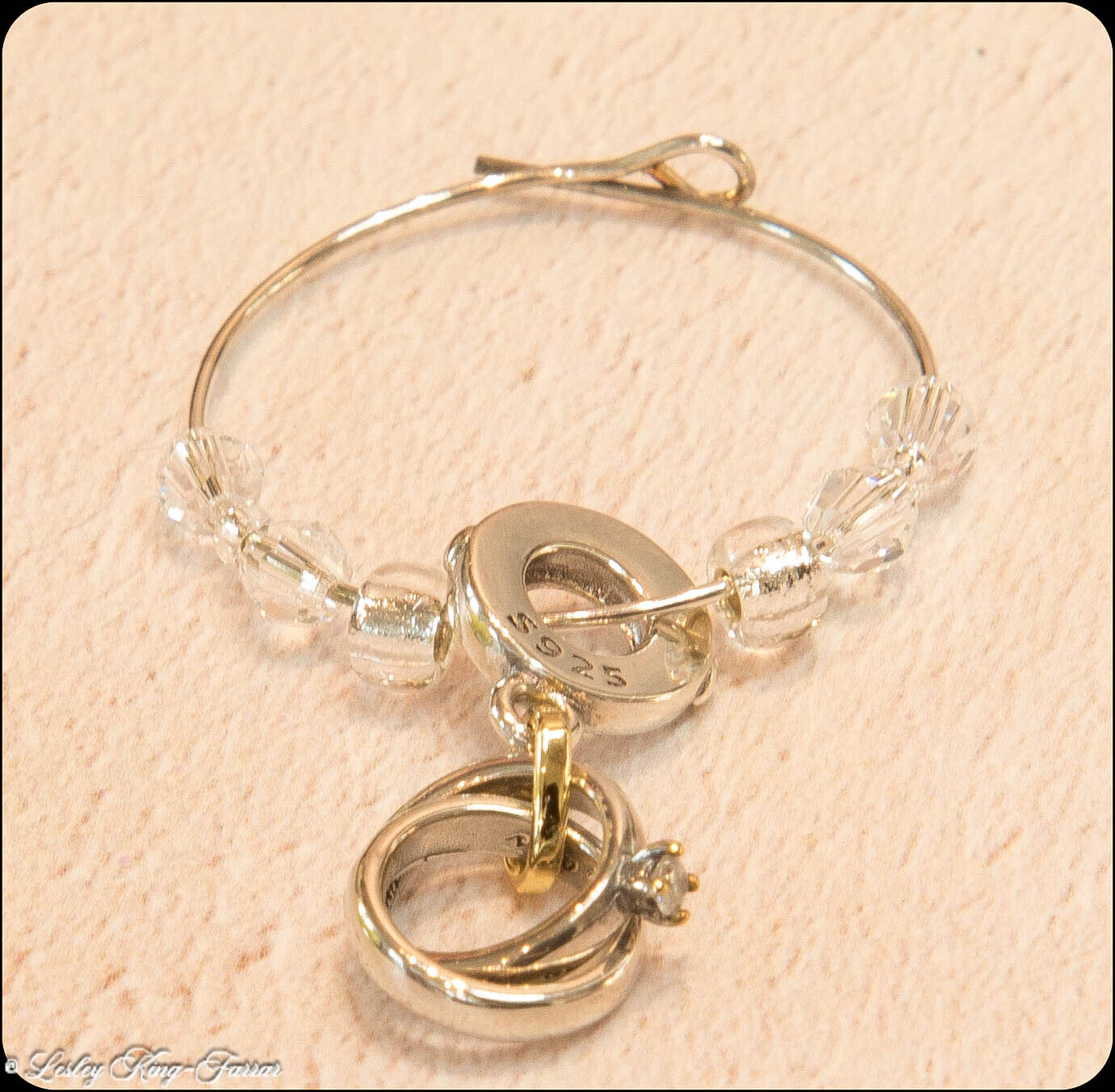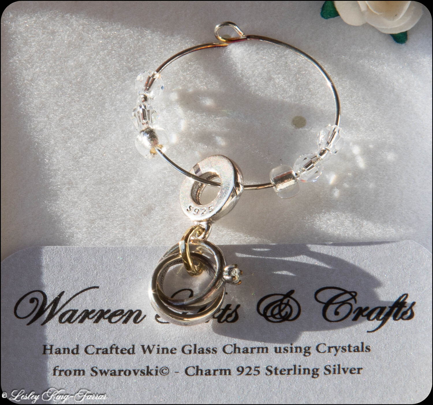Beautifull Sterling Silver Intertwined Wedding & Engagement Ring Charm, swings from a silver plated wine glass ring threaded with crystals from Swarovski© The Charm can easily be removed and placed directly on a Charm Bracelet